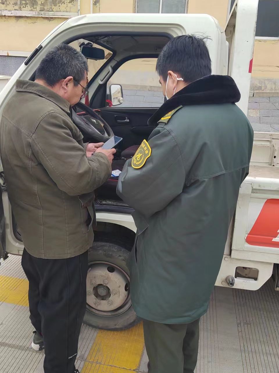 2月9日下午,天空中飘着点点雪花,一辆小货车在ETC车道驶出后停靠在廊坊西收费站外广场。班长王锁发现后上前询问情况。