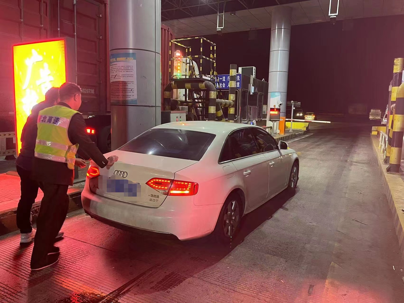 2月22日晚9时,一辆车牌号为冀R的小轿车缓缓驶入香河西收费站出口收费车道。阵阵刺耳的摩擦声快速传入正在进行收费作业的收费员耳中。收费员立即用对讲通知班长前去查看实情。班长第一时间赶到车道发现,该车右前方严重破损,防冻液泄漏,从焦急的司机那儿了解到车辆已无法挂入挡位。