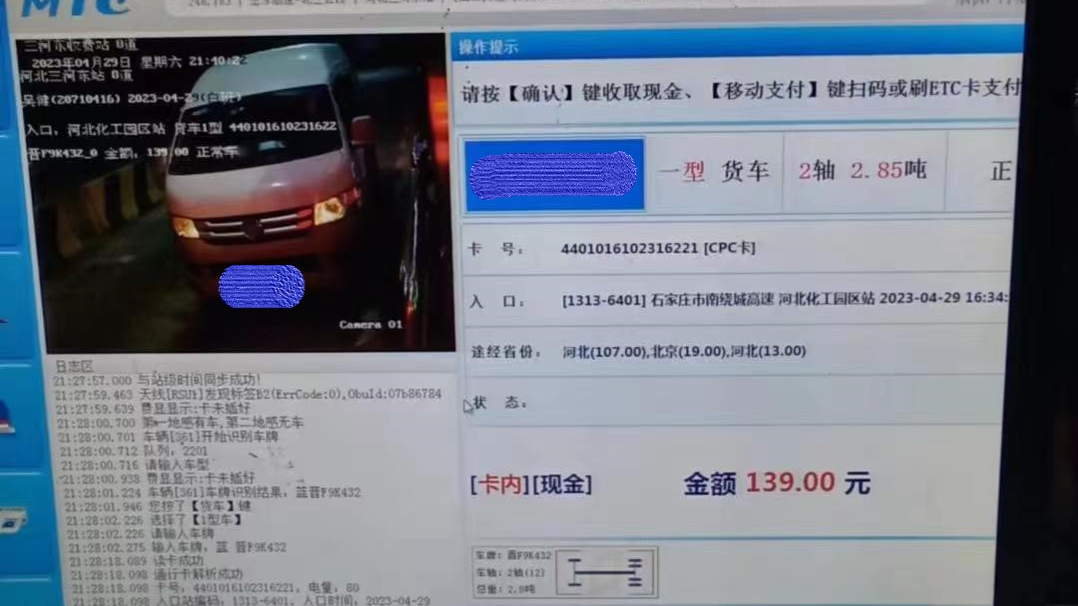 2023年4月29日21时28分,正值劳动节节免费期间,一辆面包样式的厢式货车驶入了三河东站免费车道,根据经验判断该车车身外观不是7座面包车,当班收费员第一时间进行了拦截。