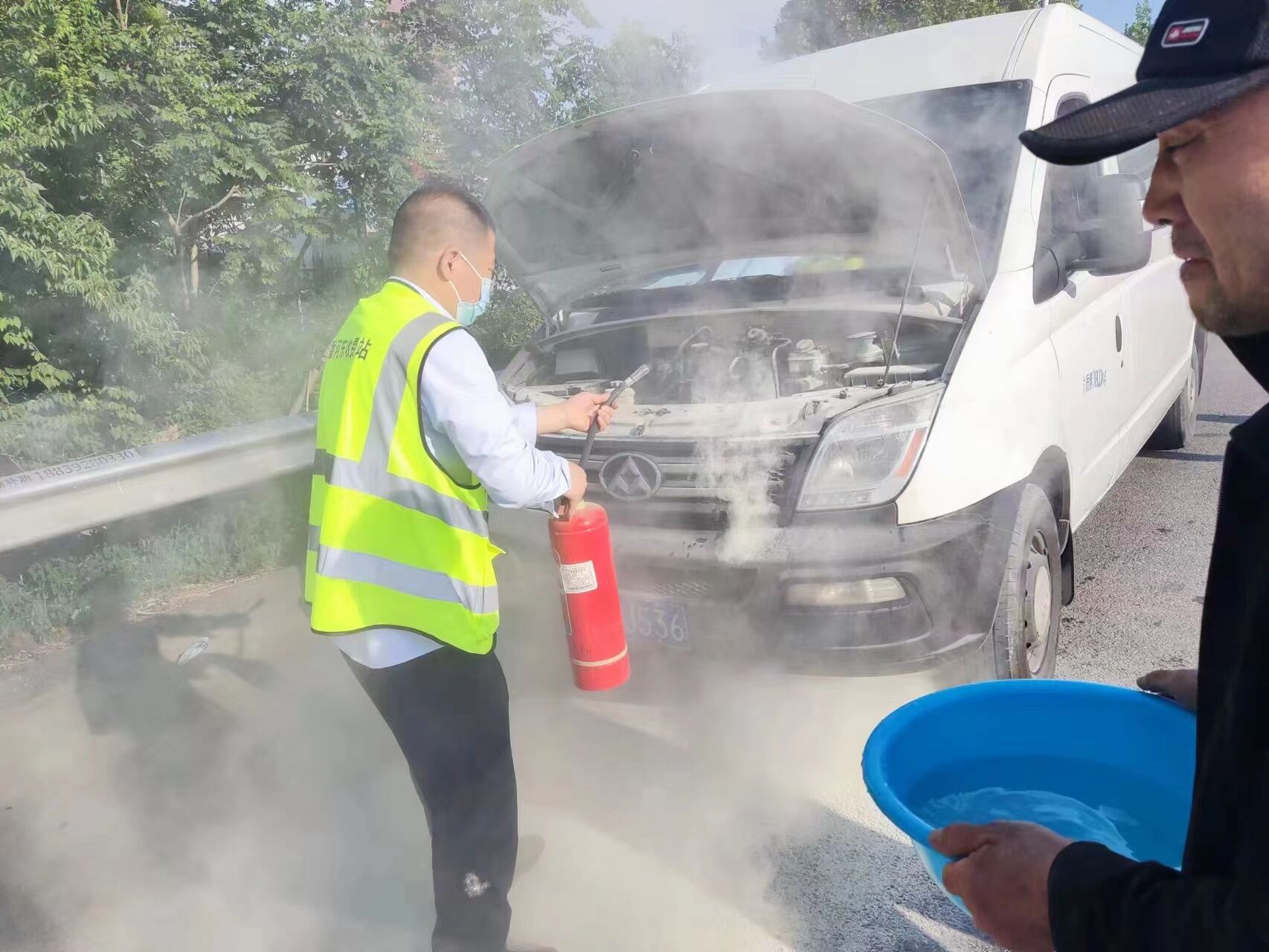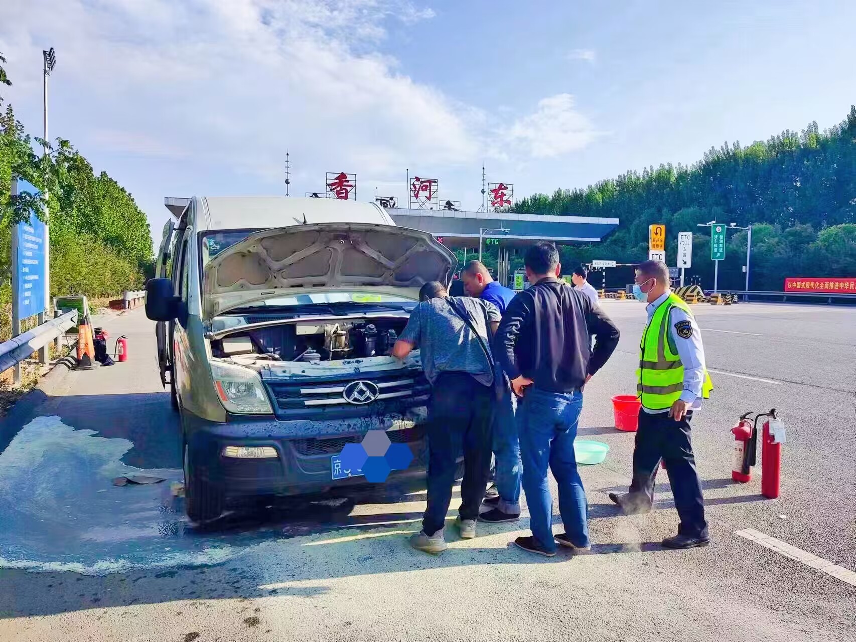 5月13日17点左右,一辆白色面包车冒着浓烟驶入香河东收费站出口车道,当班收费员崔志文见状立即通过对讲通知班长闫文忠,并迅速指挥车辆驶离收费车道,停靠在广场安全地带。