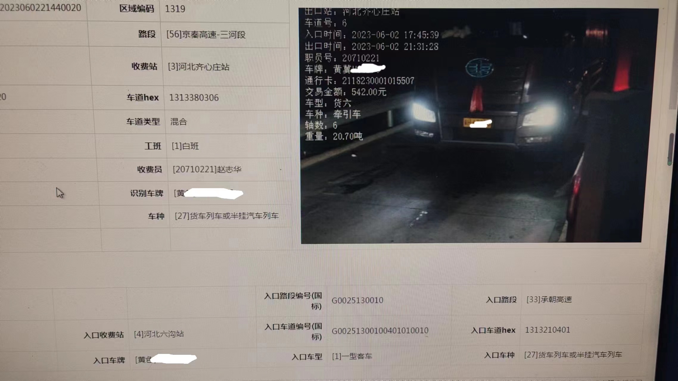 2023年6月2日21时,一辆车牌为冀H的六轴货车在齐心庄站出口102道下道时,收费员读取CPC卡信息后,显示该车辆入口车型是一型蓝牌货车,实际出口车型是六型货车,属于出入口车型不符车辆。收费员立即将情况上报当班班长。