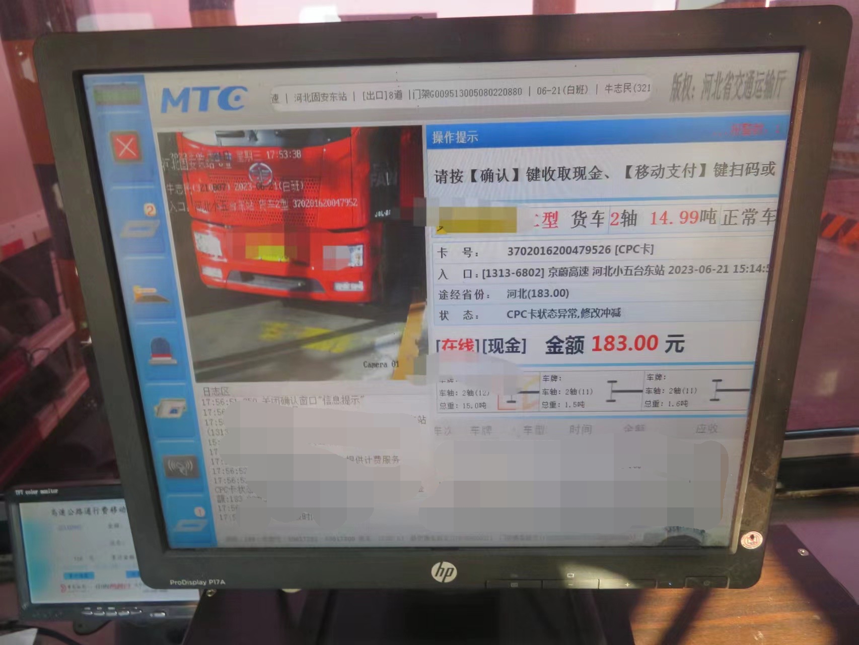 6月21日17时49分,一辆京A牌照的二轴货车驶入固安东收费站收费五道,司机对收费员韩志远说车上货物为蔬菜,要求免费通行。韩志远通过查看行驶证发现,车货总重量不足标准的80%,于是向司机说明,问询容积是否满足要求。得到司机的肯定答复后,韩志远立即通知班长张海川和验货员牛志民前来查验车辆。