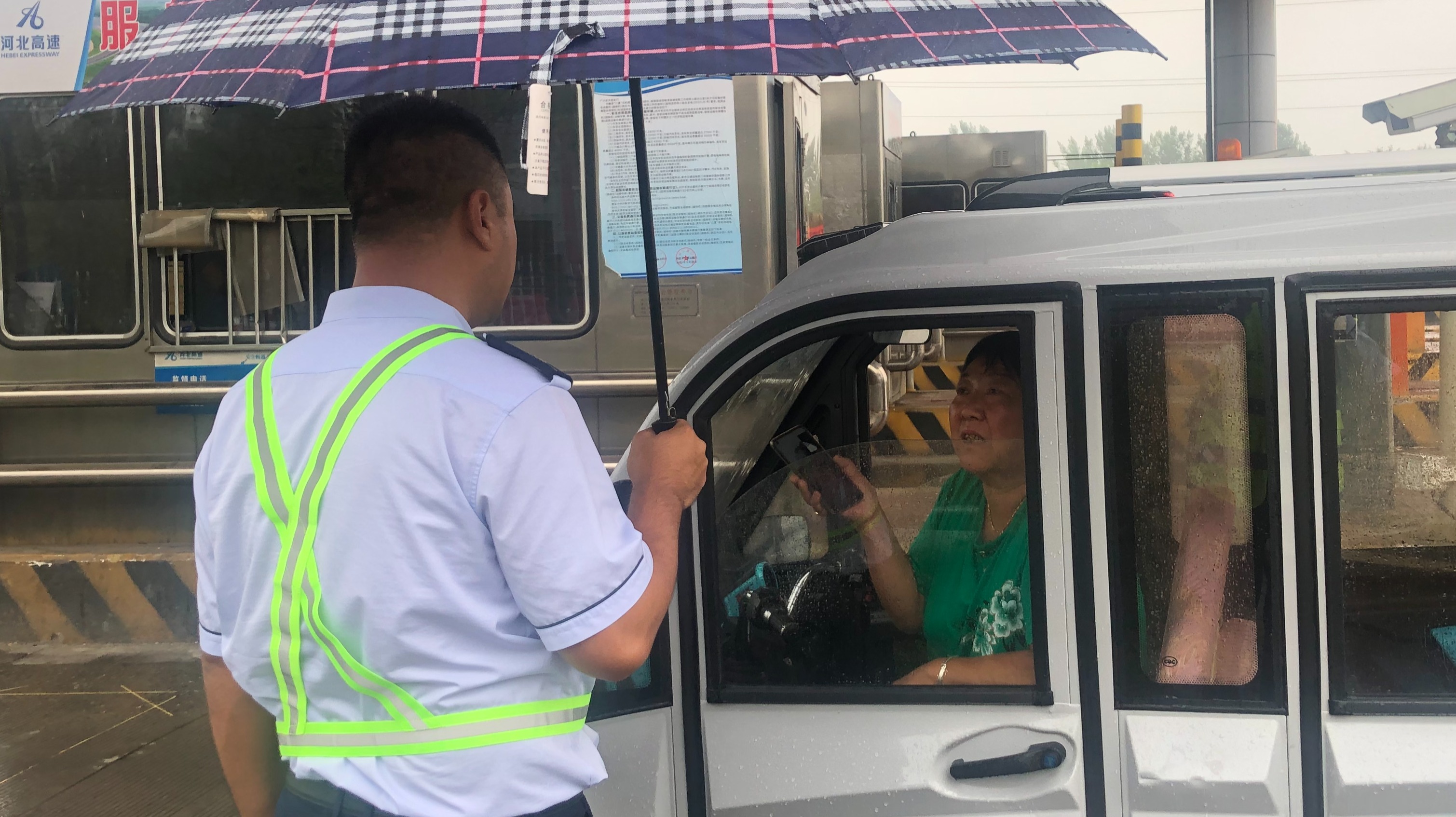 廊坊分公司三河南收费站:老人雨天误入高速 收费人员耐心劝阻