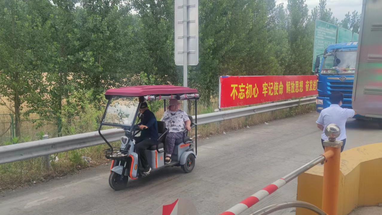 班长问道:“大爷,您这是要去哪儿啊?三轮车不能上高速。为了您的安全,请您走下道吧!”大爷说:“我要去岭子村,这里走不是近么。”班长讲解了高速公路不允许行人和三轮车通行的相关规定和行人上高速的危险,大爷认识到问题的严重性后表示以后不会再骑车通行高速公路了。随后班长给大爷指引了到达岭子村庄最近的路线,大爷对班长表示感谢后,掉头离开收费广场。