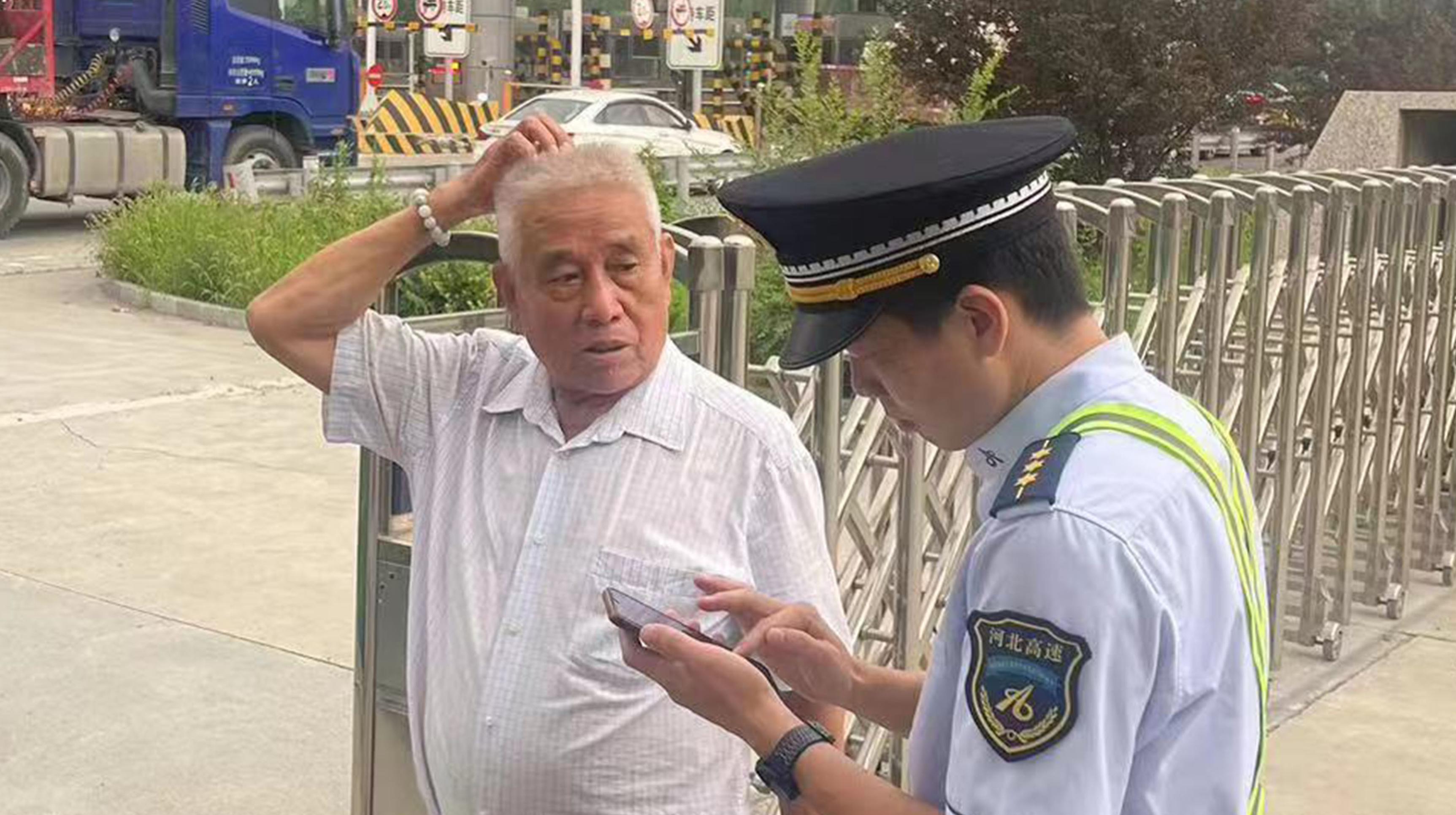 8月16日8点左右,三河东收费站入口缓缓走来一位花白发老人,老人停在入口岗亭前,焦急地询问:“同志,麻烦问一下雄安新区该怎么走?”发卡员侯浩博见状赶紧喊来备岗人员,引导老人到安全地带帮助其导航目的地,但老人因为记忆有误,无法说出准确的目的地,经过老人一番描述,备岗人员根据老人提供的描述用其手机仔细搜索,终于找到了老人要去的地方,老人拍手说道:“就是这里!你们可真是太有耐心了,哪都嫌弃我们年纪大的人笨,就你们这么认真负责!”老人一阵道谢后,满意地走向了自己车的方向。