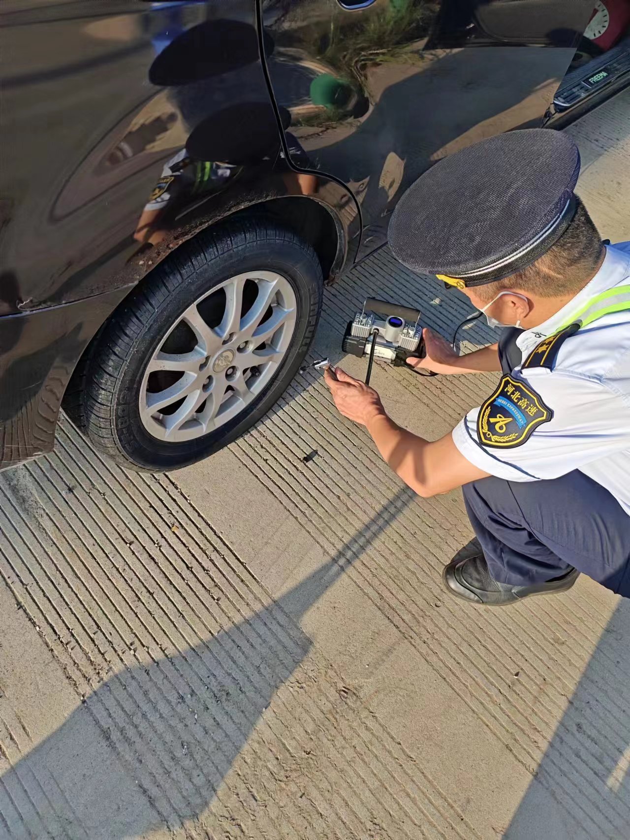 通过询问得知,该车是从涞源县前往天津市,由于胎压报警被迫从廊坊西站下道。盖江涛与司机一起查看轮胎的状态,发现该车的右后轮明显亏气,盖江涛提出为司机更换备胎的建议,司机则表示备胎在上次使用时也扎了,目前无法使用。盖江涛提供了距离收费站最近的修理厂地址,这段距离最快也要行驶十五分钟,故障轮胎的气压明显不能支撑,叫来拖车费用又比较高昂。司机正在纠结如何处理时,盖江涛取来站上新配备的电动打气泵,为故障轮胎临时补足了气压,足够行驶到修理厂了,司机感激的握住盖江涛的手说:“你们的服务太到位了,给我省了不少钱呀,太感谢了!”