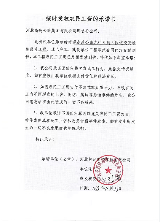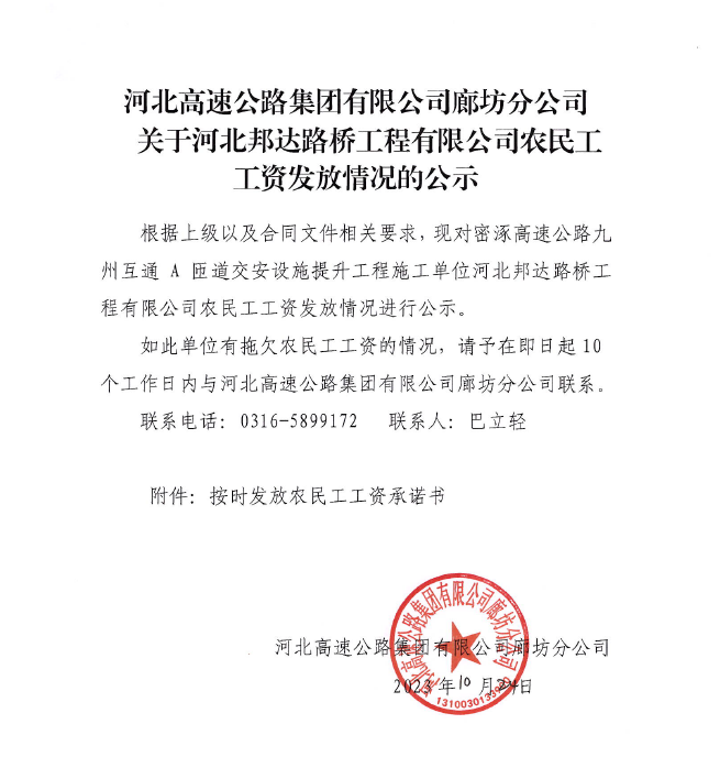 河北高速公路集团有限公司廊坊分公司 关于河北邦达路桥工程有限公司农民工工资发放情况的公示