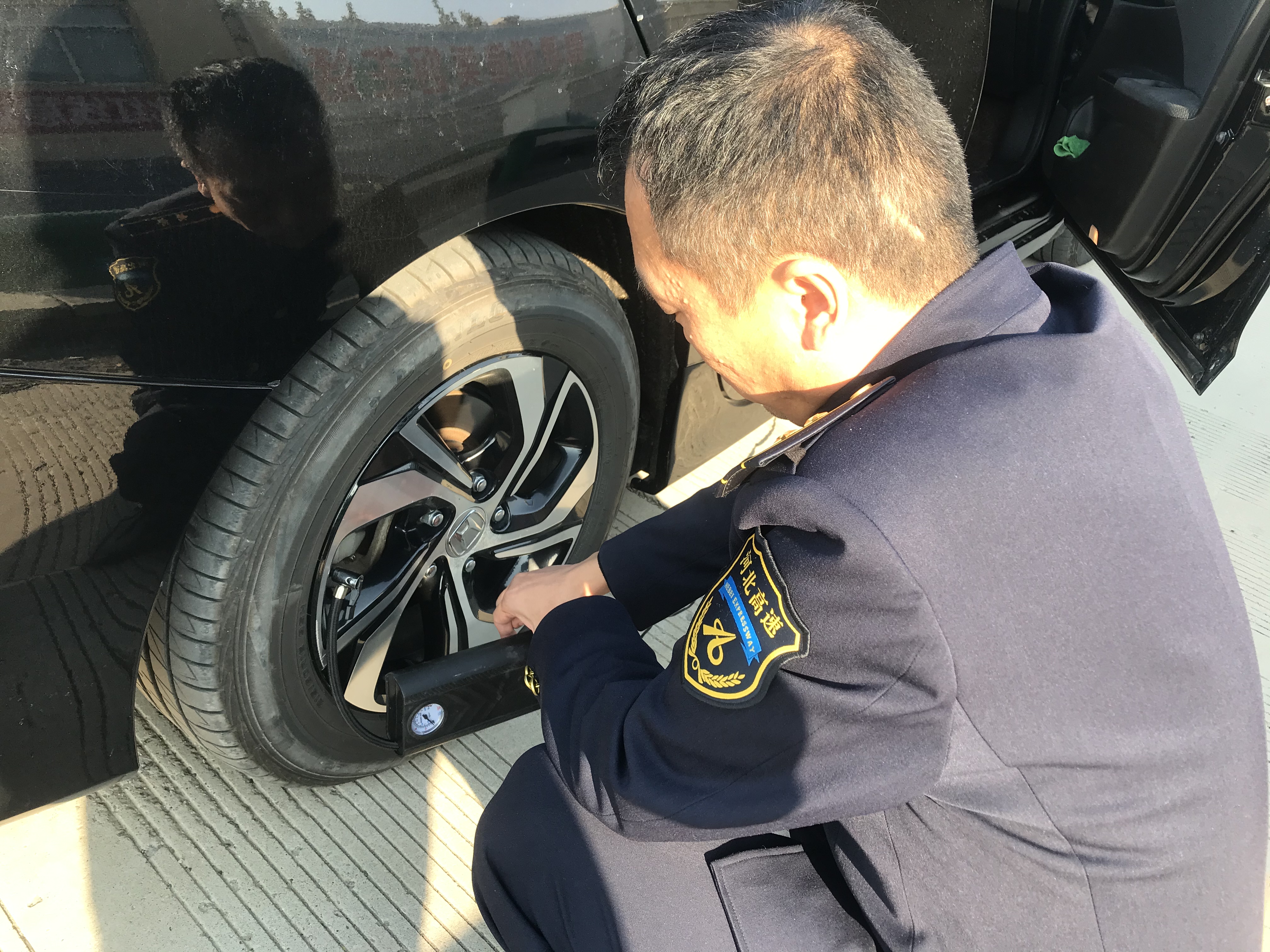 车辆缴费完毕后停靠在收费外广场南侧,班长付建也赶到了现场,经询问得知该车司机在行驶过程中发现胎压报警后立即选择了就近下道。付建与司机一起查看该车轮胎状态,发现车辆右后轮明显亏气,仔细检查发现该轮胎有一处螺丝钉扎胎情况。付建提出两个解决方案:一是为轮胎补气前往一公里处的修理厂进行补胎,二是更换备胎,司机选择了前者。付建取来电动打气泵为轮胎补气,气压足够的情况下行驶到修理厂应该是没问题的。司机对付建的帮助表示感谢后驶离了收费站。