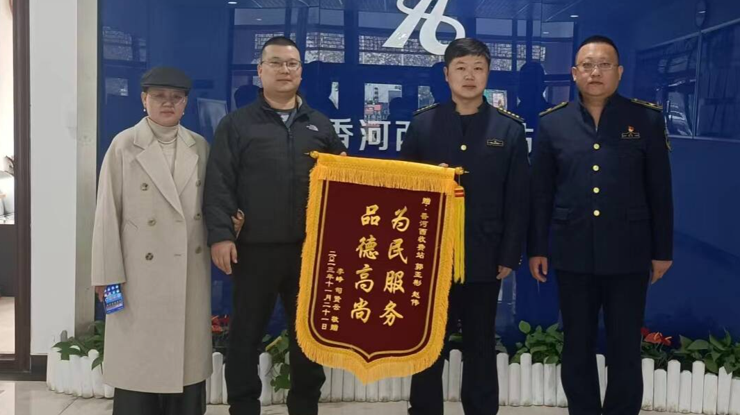 11月21日,天津市的一名男子携妻子来到香河西收费站,送来了一面“为民服务 品德高尚”的锦旗,向收费站当班收费人员的热心帮助表示了衷心感谢。