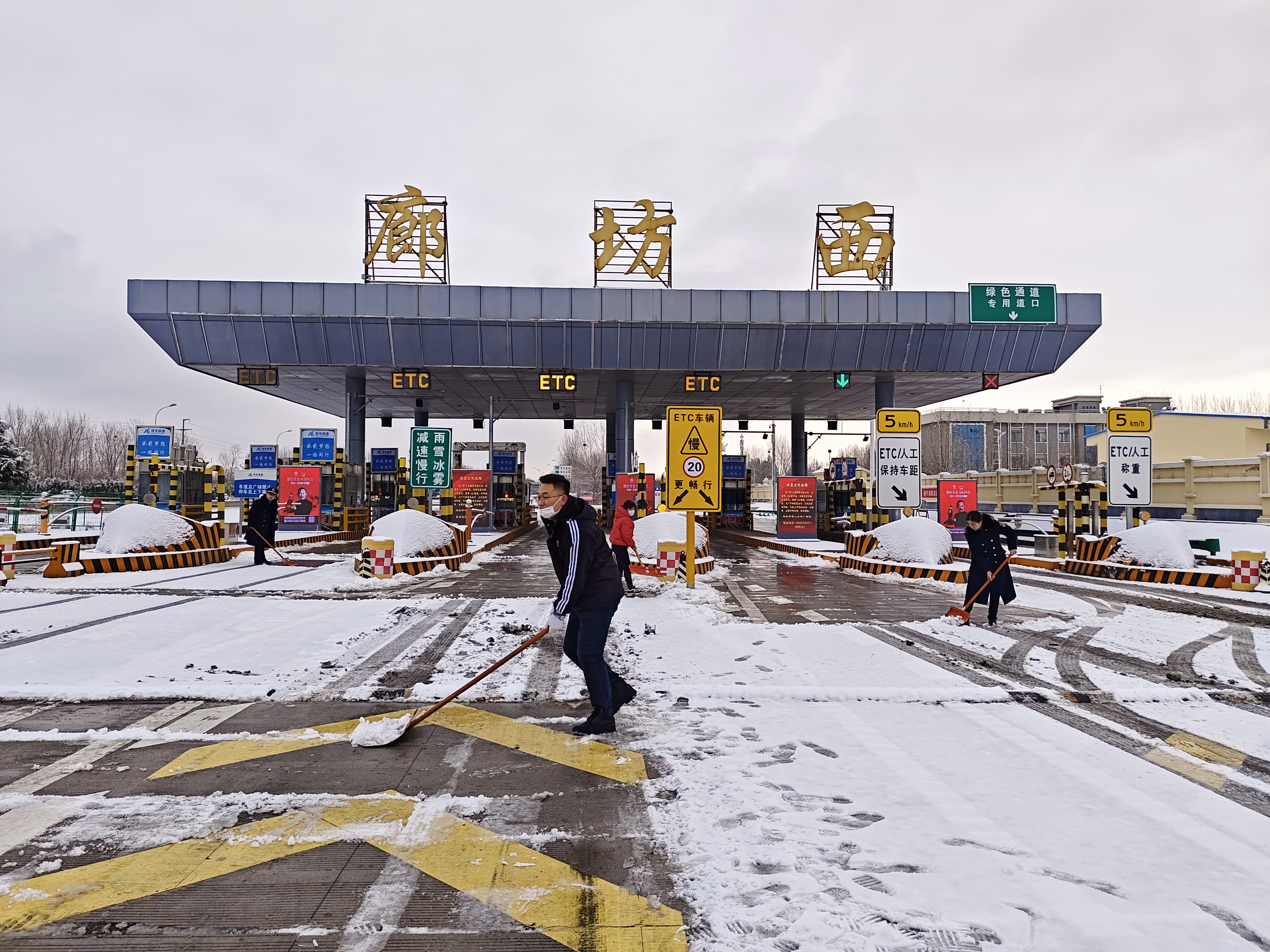 2023年冬天的第一场雪如期而至,廊坊西收费站立即启动除雪保畅应急预案。为了及时清除收费车道、内外广场的积雪,保障过往司乘人员的行车安全,廊坊西收费站成立“除雪保畅突击队”,全体人员迅速投入到紧张的除雪工作中。