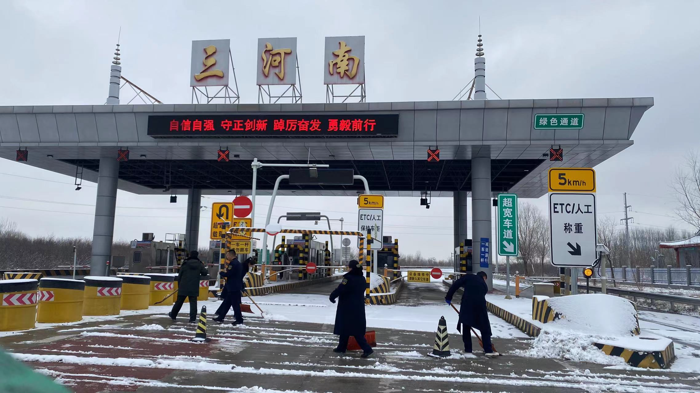 全体干部职工以雪为令,雪停后立即组织在站人员按照“车道、广场、院区”的顺序进行清扫。大家心往一处想,劲往一处使,经过一个多小时的团结协作,三河南收费站收费车道及广场积雪已全部清理干净,大力确保了司乘人员和站区工作人员的出行安全。