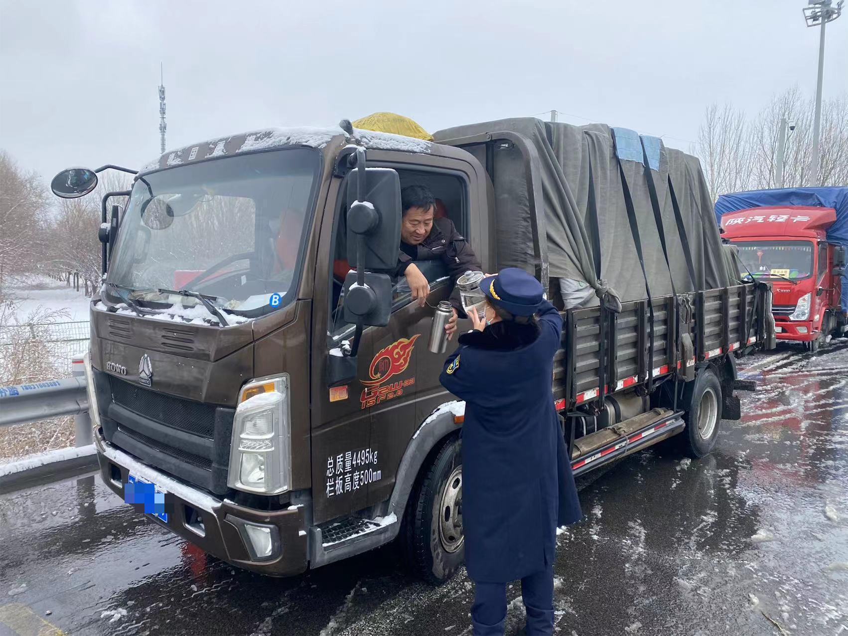 收费员纷纷提上水壶、端上水杯,将一杯杯热水送到每一位在路边等待通行的司机手中。同时,他们还提供道路咨询和指引服务,耐心帮助司机规划行车路线,安抚大家的情绪。这一举动不仅在寒冷的冬天里为司机朋友们送去了温暖,更传递了人与人之间的关爱与互助。