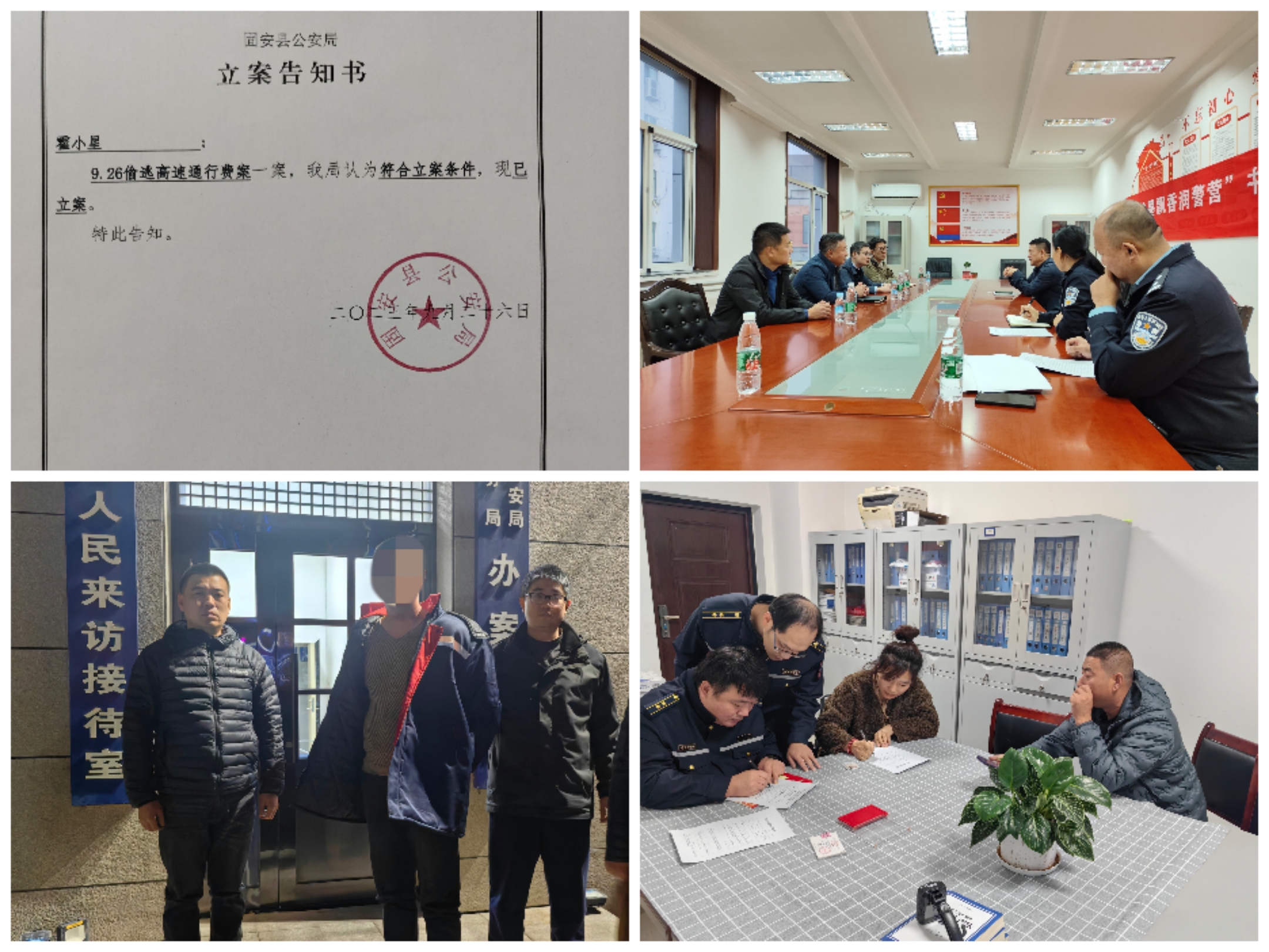 2023年4月,稽核人员在日常数据分析时发现,一批车牌为黑、吉、辽的六型货车存在反复更换牌照行为,并且入出口车辆颜色型号均不同,通过对比门架信息、入出口时间、入出口抓拍图像发现,该批货车有重大逃费嫌疑。廊坊分公司领导班子高度重视,迅速组织稽核业务骨干成立专案调查组,展开深入调查。经过5个多月的调查取证,专案调查组按图索骥,通过车辆关联,发现逃费团伙规模逐步扩大,廊坊分公司立即向廊坊市固安县公安局报案。警企合作,采取公安情报与稽核数据相结合的方式,于10月至12月期间,多次辗转前往吉林、辽宁、黑龙江、山东、内蒙古等省份,展开千里追踪调查,有效推动了追缴工作的开展。