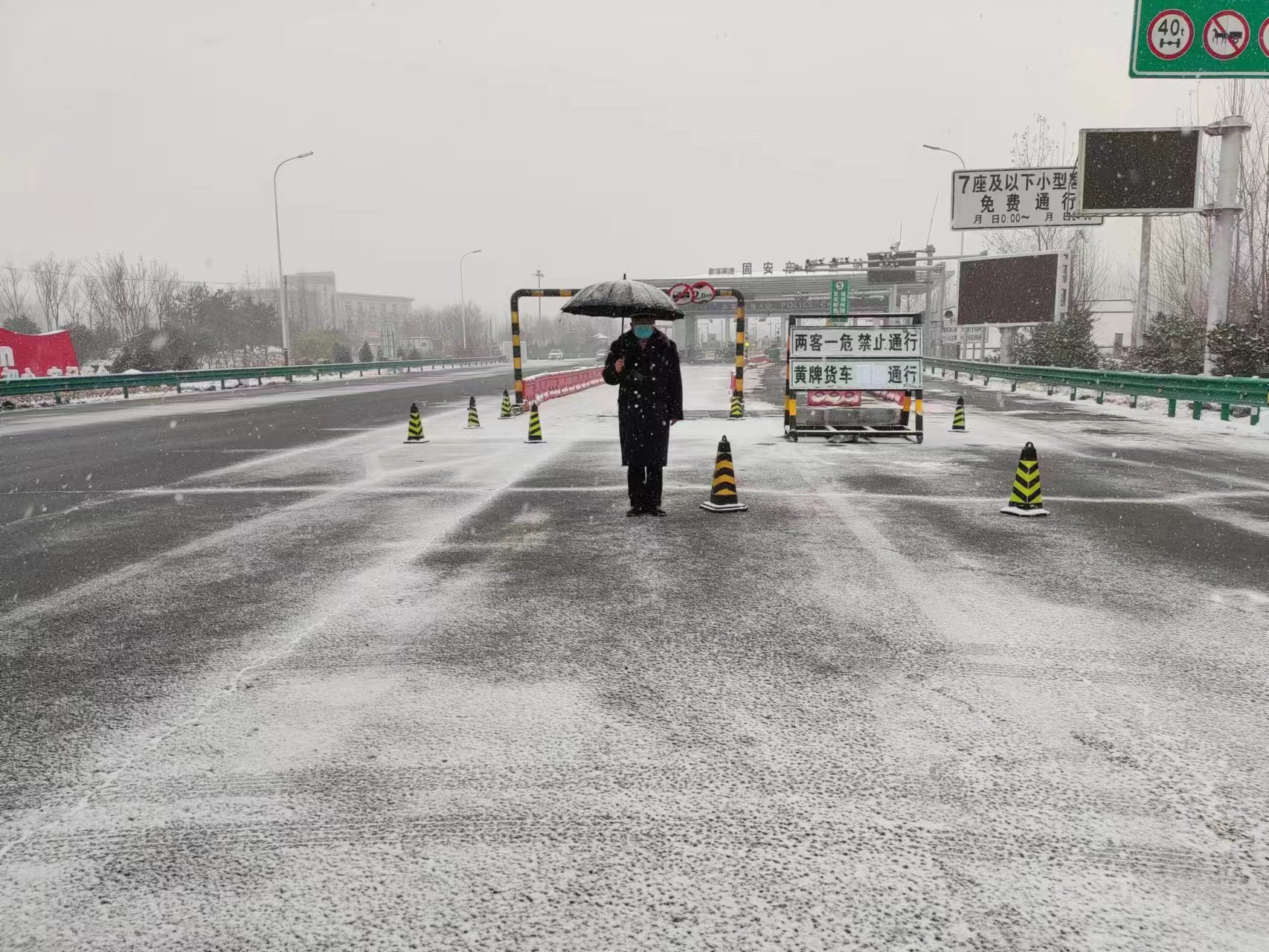 受新一轮寒潮天气影响,12月13日上午10时固安东收费站迎来入冬后第二次降雪,同时陆续接到高速交警的多项交通管制通知。接到管制命令后,在岗作业的收费一班迅速响应,摆放管制标志牌、反光锥筒提醒过往车辆,同时利用站口扩音器反复播放管制内容。由于路面湿滑、车流量大,为确保所有车辆安全通行,安排专人在称重检测车道入口外进行疏导,就交通管制的原因、措施、行驶路线等内容向司乘人员进行详细的解释,引导过往车辆有序行驶,杜绝安全事故的发生。