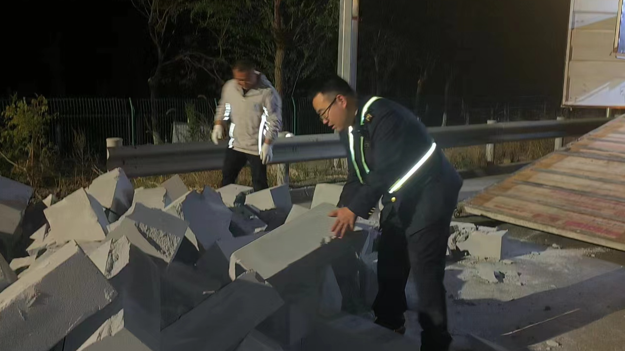 收费班长立刻拦停该车,并告知其有砖块散落,同时指挥其将车辆停至收费广场安全位置,帮其摆放好三角反光锥,经过近半小时的努力,与司机合力将洒落的泡沫砖块装入车中。司机对班长的帮助连连感谢,班长表示这都是自己应该做的,同时为其讲解货车装载不规范对公众安全带来的危害。司机深刻认识到车辆存在的安全隐患,再次感谢后驶离收费站。