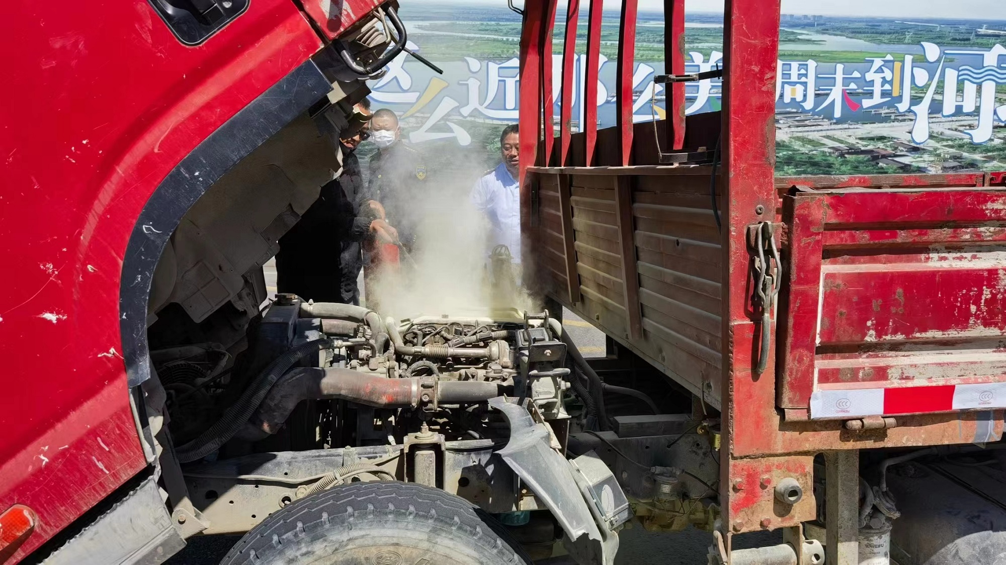 火扑灭后,班长并没有离开,协助司机把车推到安全地带、联系拖车,在等待拖车的时候,班长孙海龙和司机查看货车起火的地方寻找起火原因,原来是发动机过热导致发动机与汽车线路板连接的电线被引燃。不一会儿,拖车到达把小货车拖上拖车,临走前,司机握住班长的手感激地说:“我是从北京开车去宝坻的,路上我就总闻着车里有烧胶皮的味道,就知道车出问题了,赶紧就近下高速,还好有你们的帮忙,要不然我的车就烧报废了!真的太感谢你们了!”