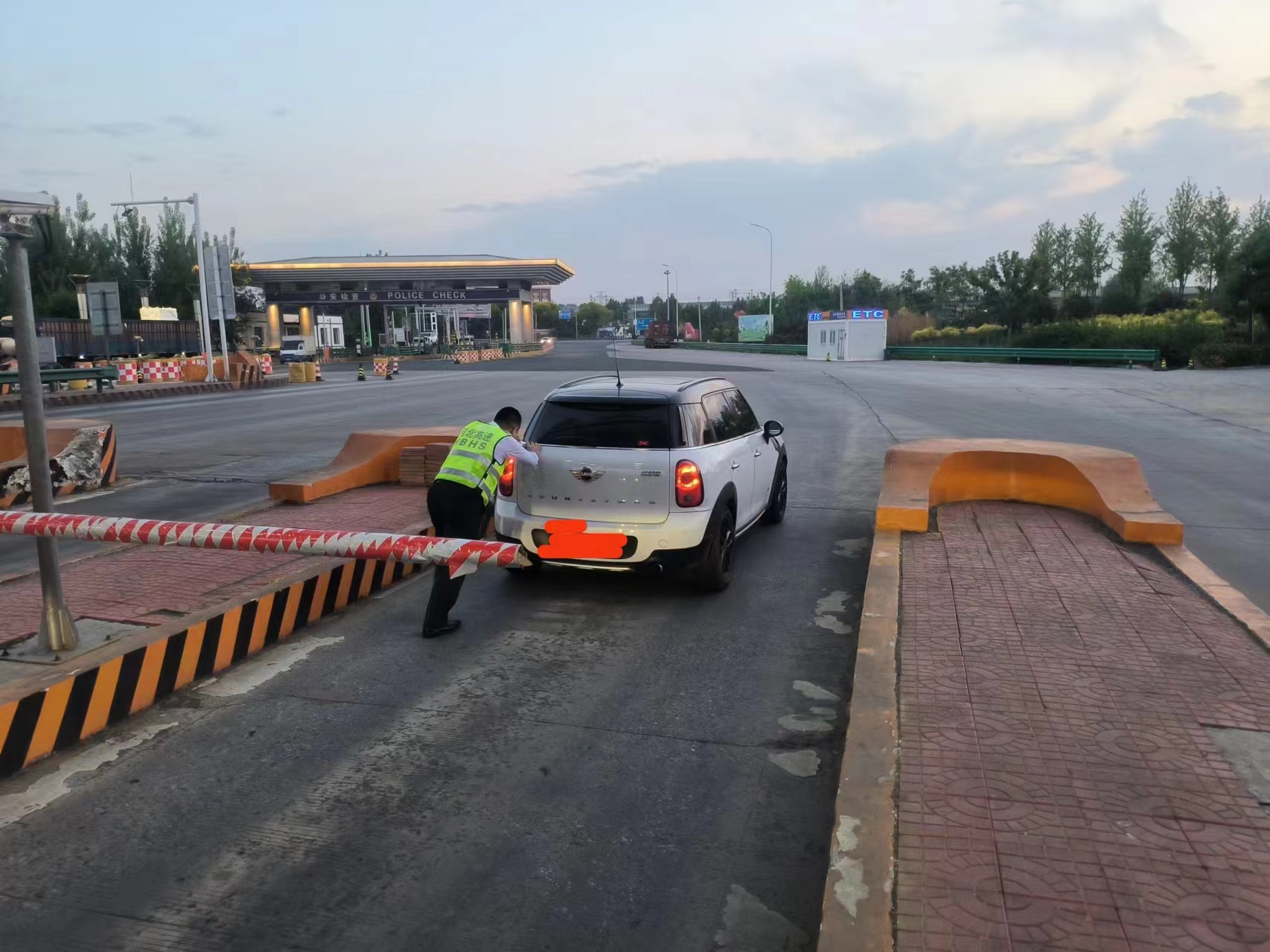 5月7日19时15分,一辆车牌为冀A的小型客车打开双闪灯停在固安东收费站下道收费广场右侧,车上下来一名女子围着车正在焦急地打着电话,在收费105车道收费作业的金万磊见此情景,意识到司机可能需要帮助,立即报告班长刘星前去了解情况。