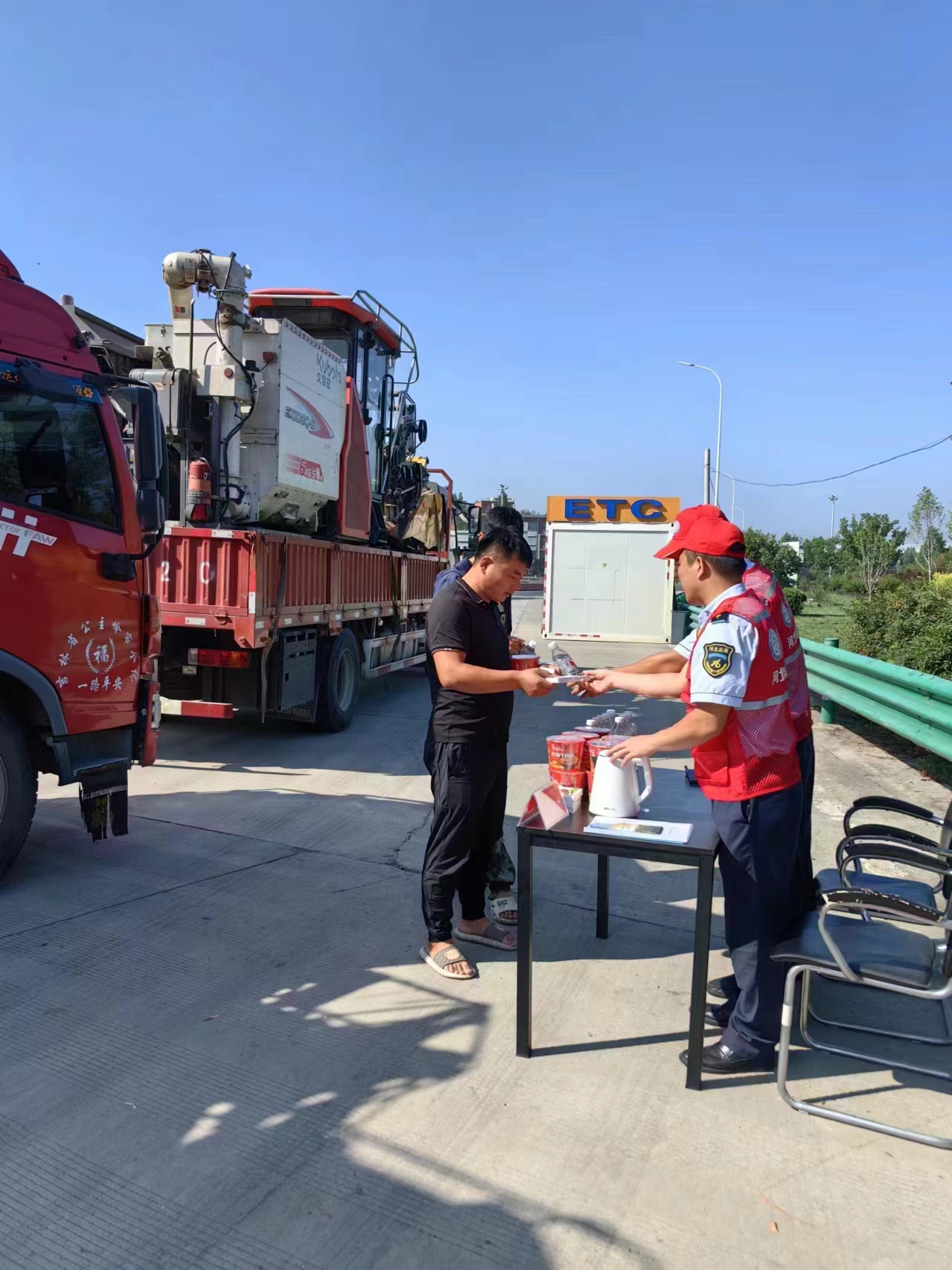 第二,在站口设置“跨区作业车辆服务台”,为“机手”提了矿泉水,方便面等物品。通过提供“三夏”服务电话,发放宣传资料等方式,为跨区机手在气象,作业信息,机械维修,油料供应等方面提供指引。