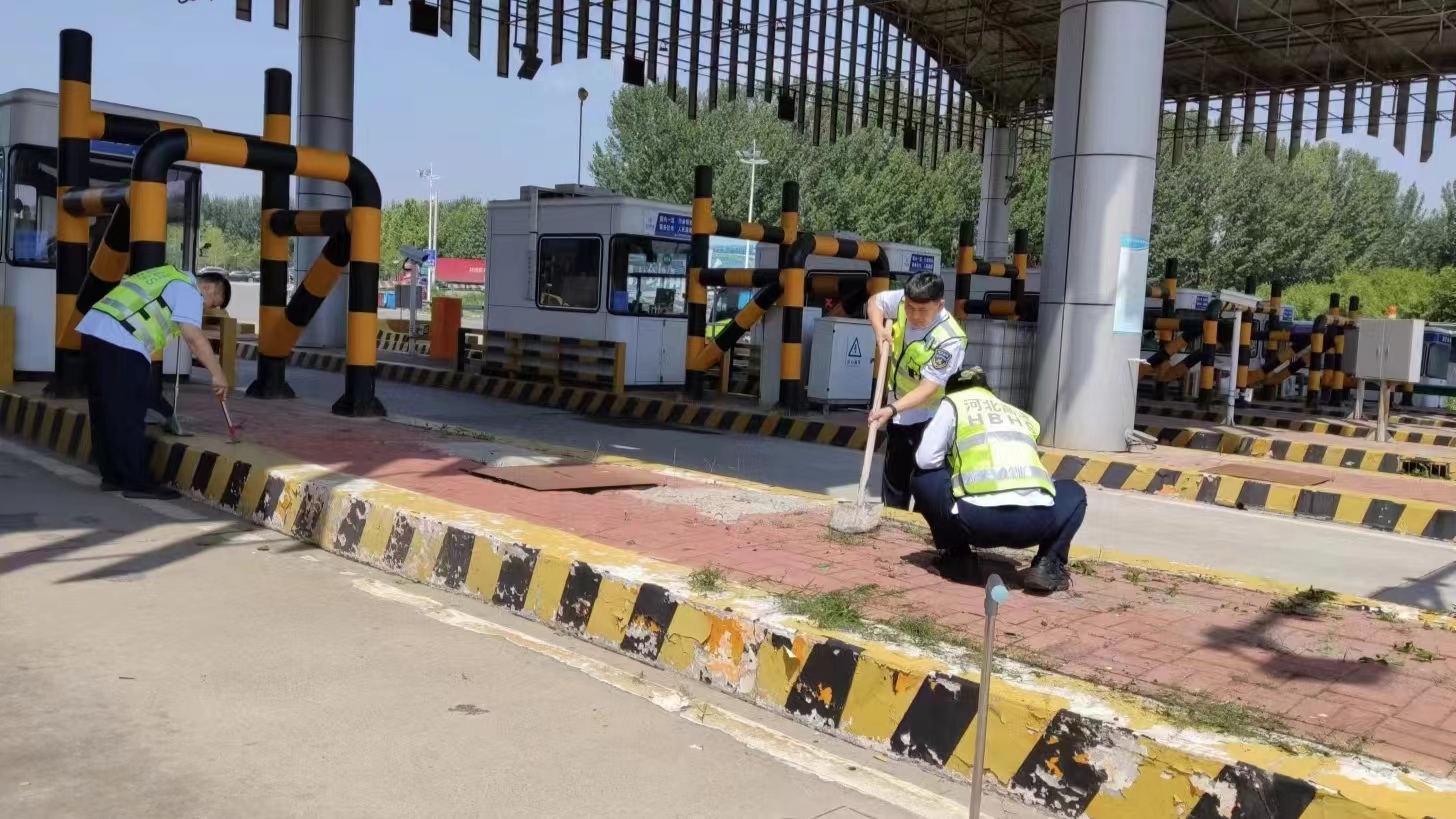虽然是早上,但气温已经达到32度以上,且气温还在持续升高,但职工们不畏高温、不怕辛苦,分工明确,通力合作。站长带领办公室人员将陈旧破损的隔离墩进行移除,更换了新的隔离墩并摆放到位;副站长带领稽核人员、机电人员对车道进行逐条清扫;刚下夜班的班长带领本班人员对每个岗亭卫生进行打扫,对船岛上的杂草进行铲除,经过近2个小时高温的沐浴,收费岗亭窗明几净,收费站区清扫无垃圾,船岛上无杂草。