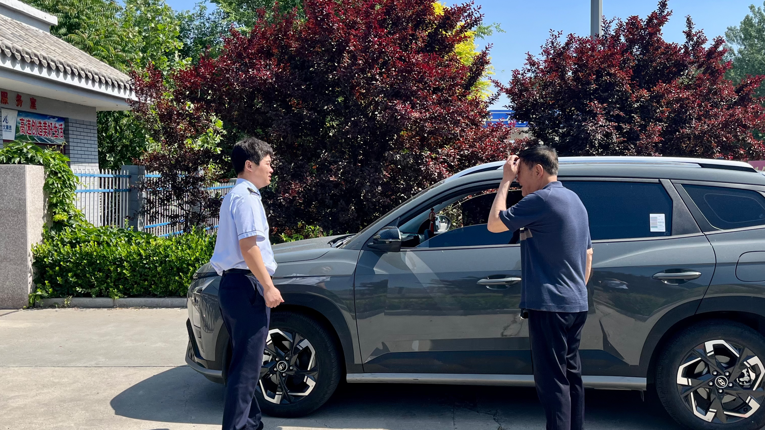 2024年6月28日,一位司机师傅在三河东收费站门口停靠,值班人员连忙上前查看。