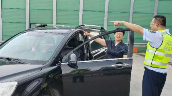 2024年8月16日10时41分,一辆小轿车驶出燕郊西收费站停靠在外广场,正在广场巡视的工作人员随即上前询问情况。