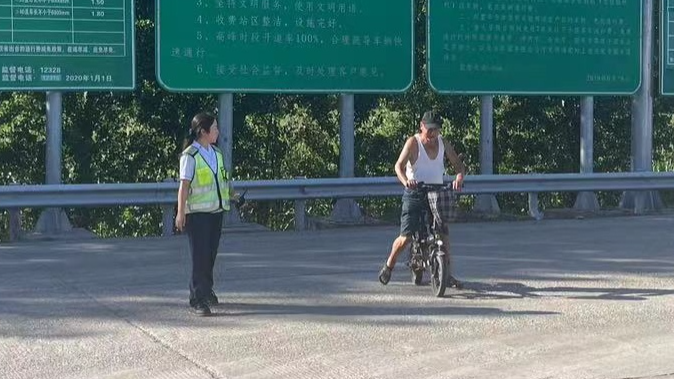 8月23日上午,一位老大爷骑着电动自行车缓缓靠近香河西收费站入口车道,正在疏导车辆的班长发现该情况后,立即上前,礼貌地拦下了这辆电动自行车。