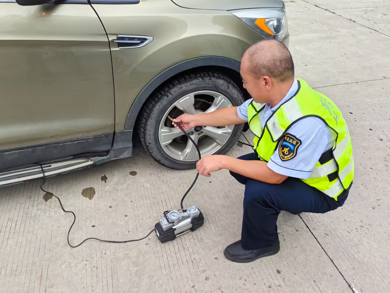 8月27日下午,一辆小型客车驶入三河西收费站收费车道,司机缴完费后正要驶离收费车道,在岗收费员突然发现该车轮胎出现漏气现象,于是赶忙提醒司机。