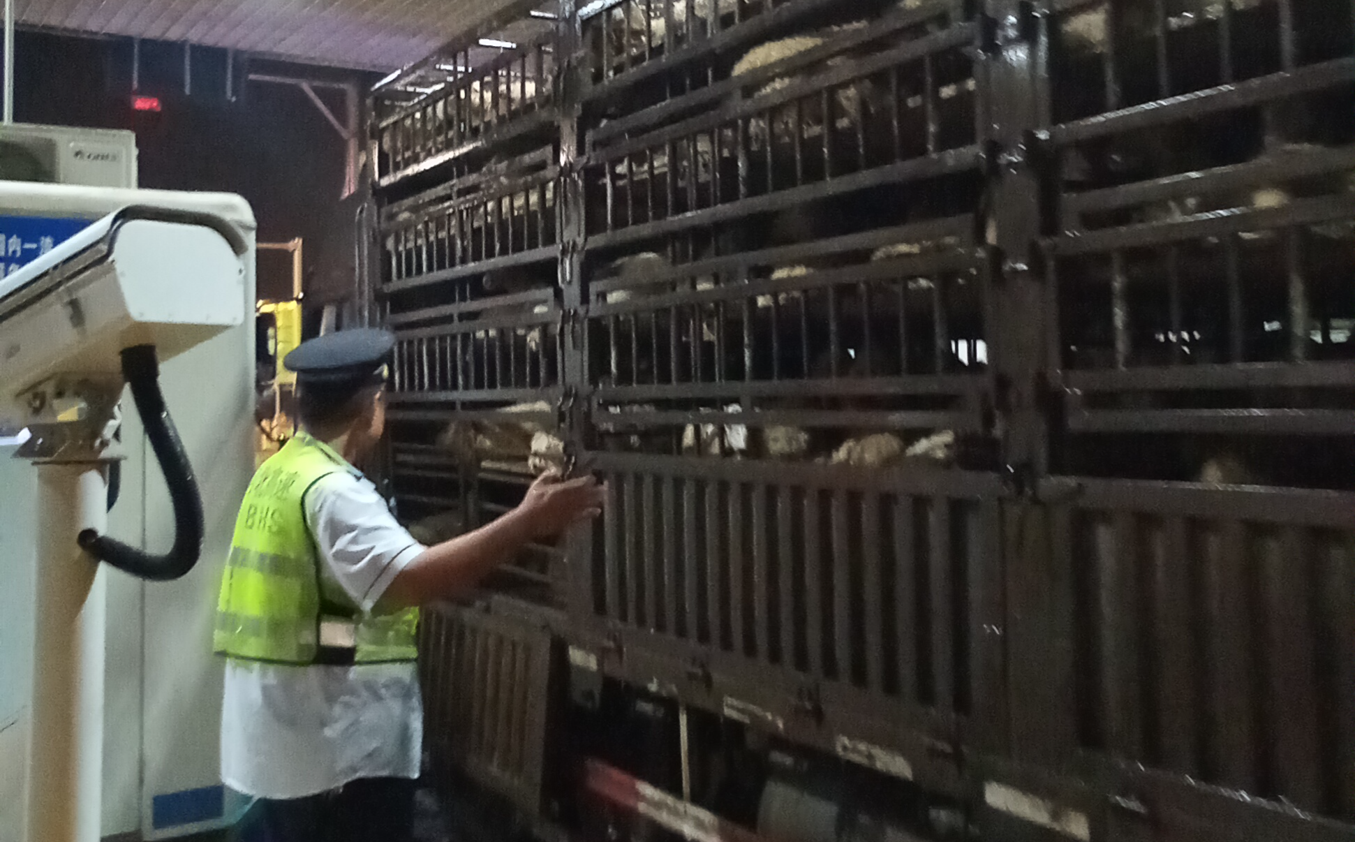 9月5日凌晨,天空突然下起了大雨,一辆满载活羊的大货车从香河东站入口不远处停滞不前,司机开启双闪灯,下车查看情况。