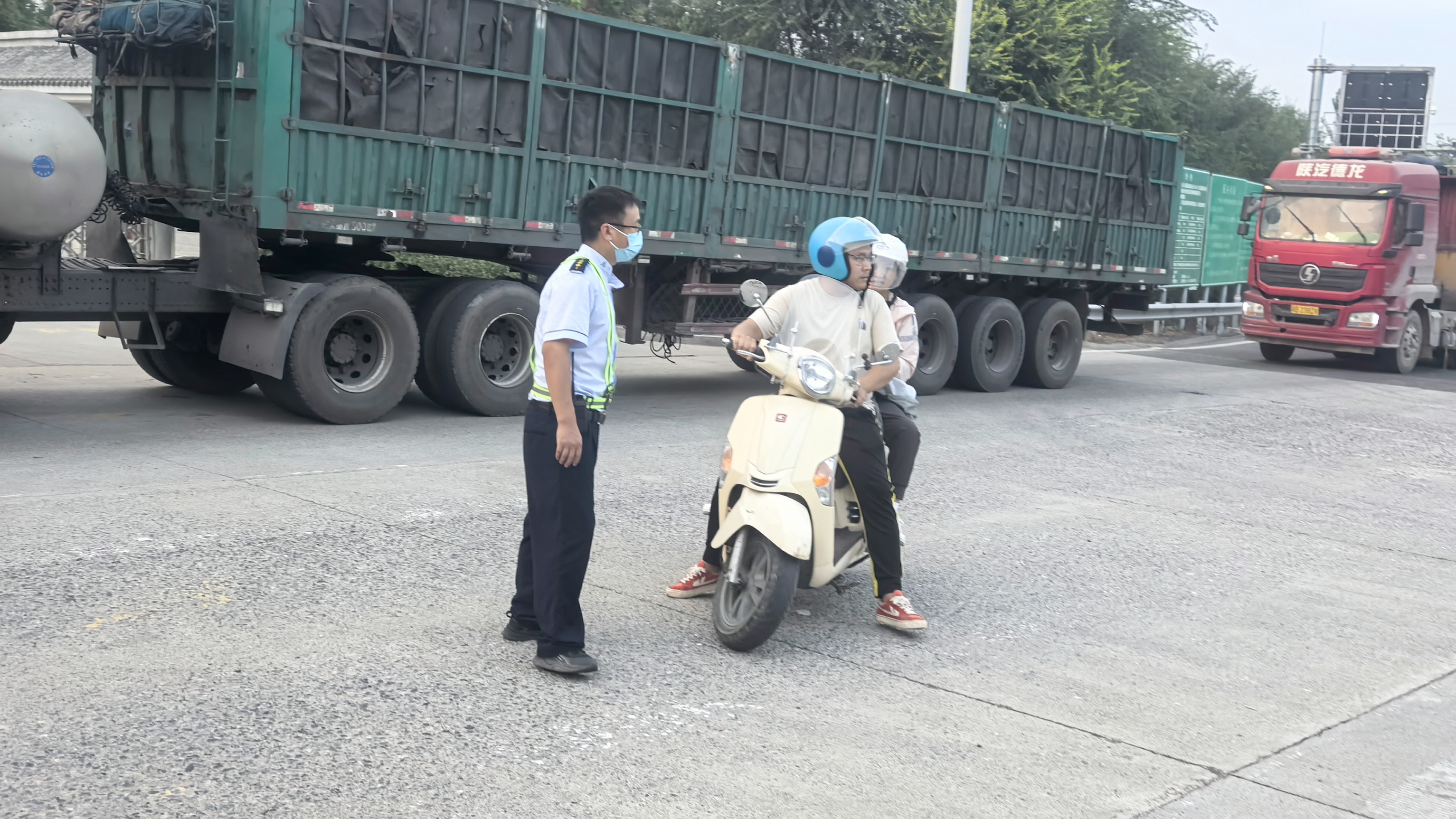 9月26日上午,一位男子带一位女士骑着电动车晃晃悠悠地向三河东收费站入口驶来。疏导员见状迅速上前制止:“师傅停一下,这里是高速公路,您这样太危险了!”为保护人与电车安全,引导车辆返回安全区域。