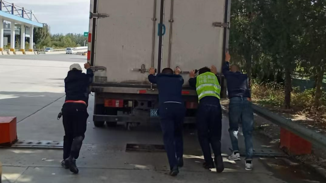 10月22日上午,一辆厢式货车在燕郊收费站交完费后突然打不着火,在车道抛锚了。当班收费员通知班长后,班长立即组织班组备岗人员一起帮忙推车,把车辆推出收费车道,在安全的地方等待拖车救援。但因为车辆满载货物,两名收费员无法推动车辆,在大家一筹莫展之际,在隔壁车道交费的两名司机大哥主动过来帮忙推车。大家齐心协力把货车推出车道,停靠在路旁。车主对收费站工作人员及帮忙司乘人员表达了感谢。