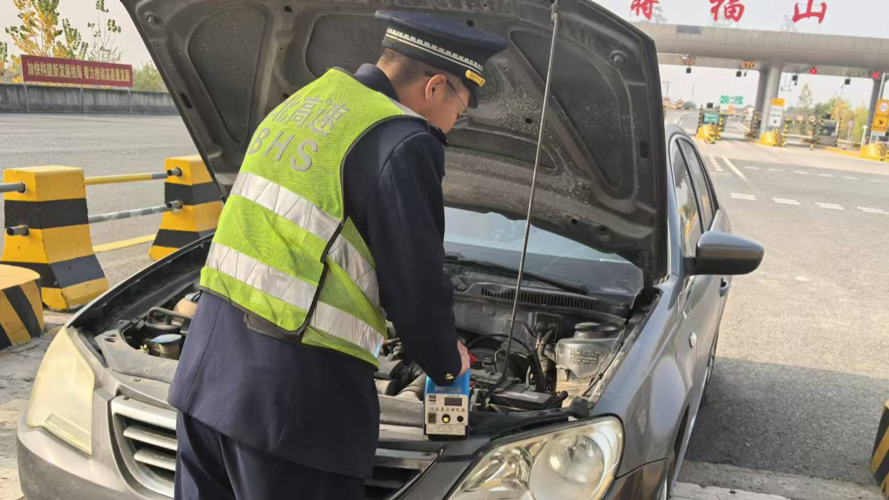10 月 29 日,在蒋福山收费站出口,一辆灰色小轿车突发故障无法启动。得知情况后班长迅速赶来,经过仔细检查发现车辆故障原因是由于电瓶亏电导致的无法启动。在安抚好司乘人员后,班长从便民服务室取来应急启动电源,为亏电车辆通电,成功帮助司乘人员解决难题。