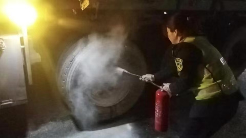 10月30日凌晨4时左右,一辆载满货物的大货车带着滚滚白烟进入香河收费站出口车道,当班收费员李秋然看见后,赶紧提醒司机熄火下车。这时司机还浑然不知轮胎已着火。在这紧急情况下,收费员立即关闭车道,通知班长,拿起灭火器去灭火。