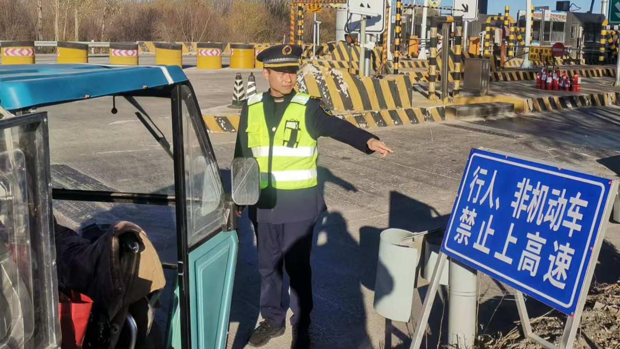 经了解,驾驶老人为附近村民,欲行驶高速公路前往黄土庄镇探亲。疏导员指着入口处“行人、非机动车禁止上高速”的指示牌,耐心向老人讲解误入高速行车的严重危险性,并指明前往目的地的正确路线。老人在离开时,对站区工作人员的及时提醒与热心帮助连声道谢。