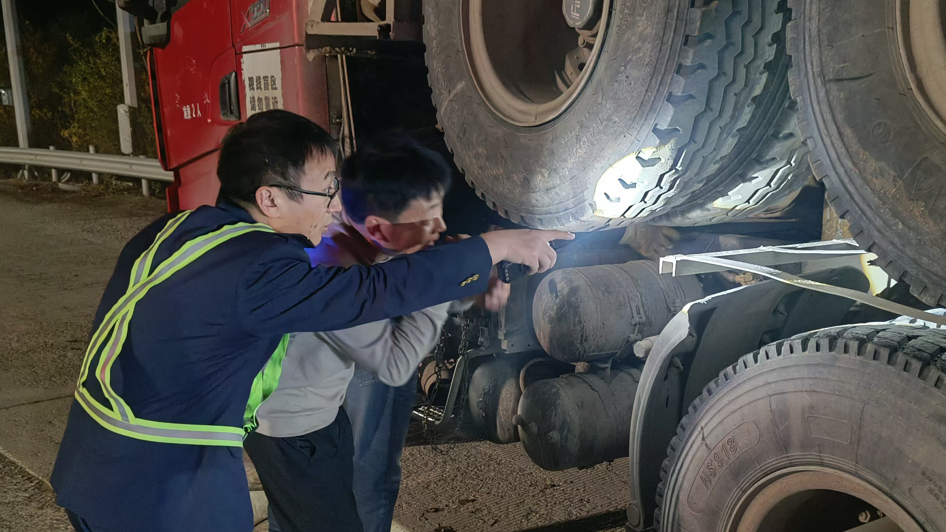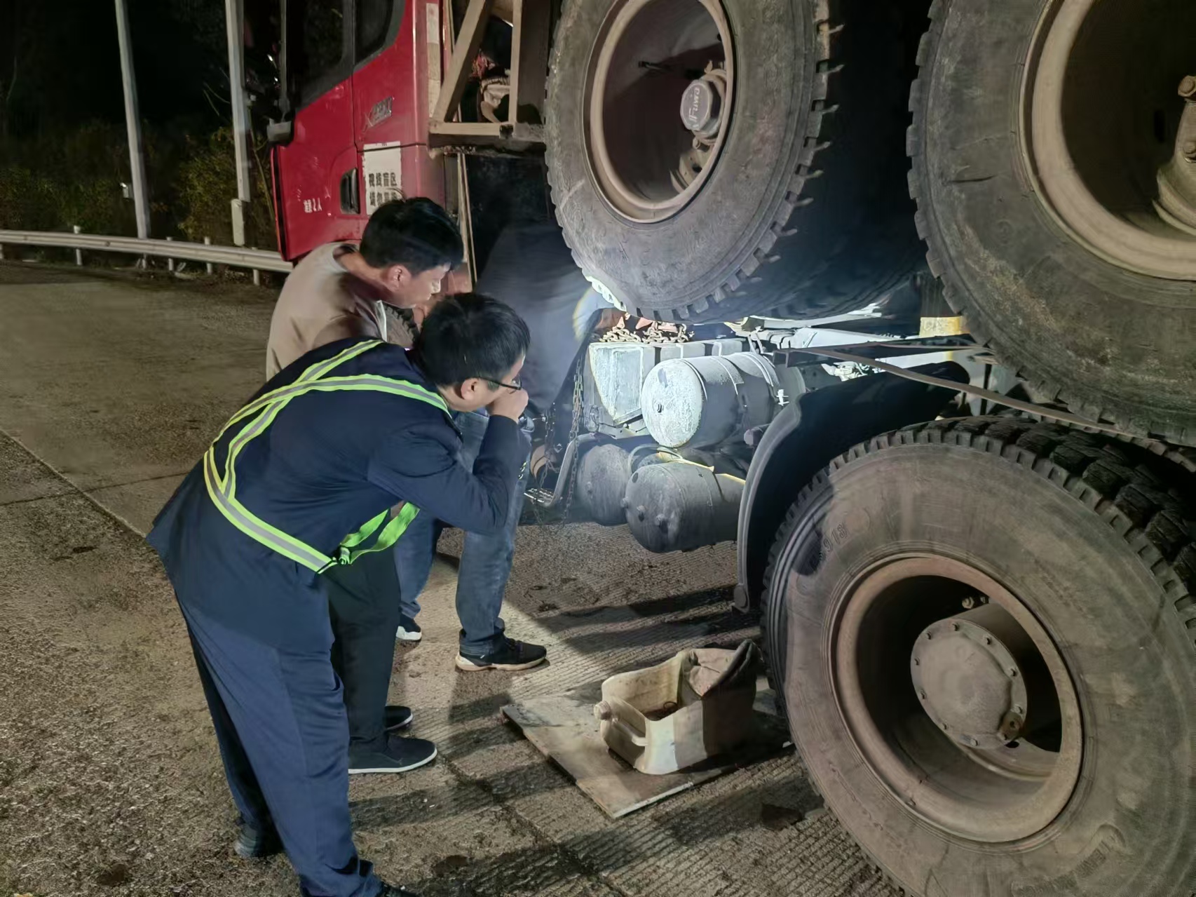 班长将车辆引导至安全区域并摆放好反光隔离墩,找来手电与司机一同查看,找到了异响的出处,询问司机是否需要帮助联系附近修车厂检修,司机赶忙道谢,对工作人员露出了满意的笑容。