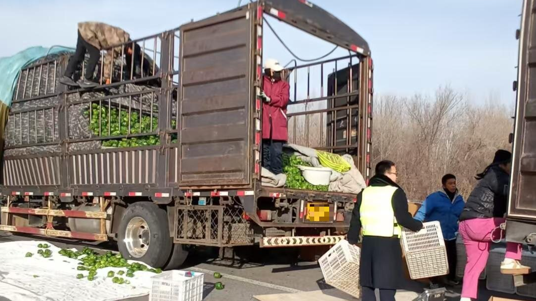 12月10日上午9时许,一辆二轴货车因事故停滞在三河南收费站外广场,车上满载绿通货物。现场装卸师傅紧急将散装的青椒装箱并转运至另外两辆货车。