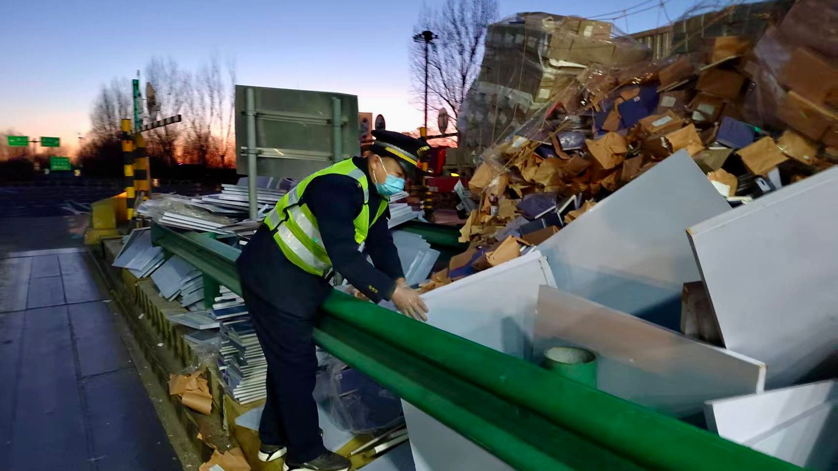 1月14日,河北高速廊坊分公司东湾站下道口,收费员们化身暖心“搬运工”,帮助司机将散落的货物重新装车,顺利开往货运目的地。