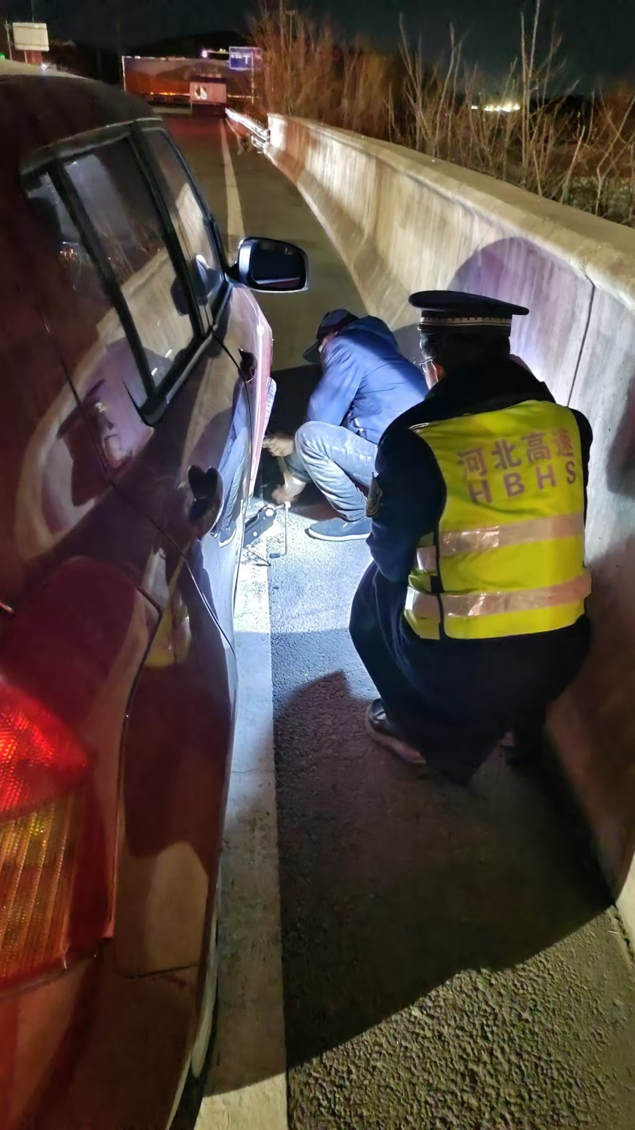 1月17日凌晨3时,气温极低,寒风凛冽如刀割。一辆小客车在高速公路行驶途中前胎突然没气,为保安全,司机立刻就近驶下高速寻求帮助。