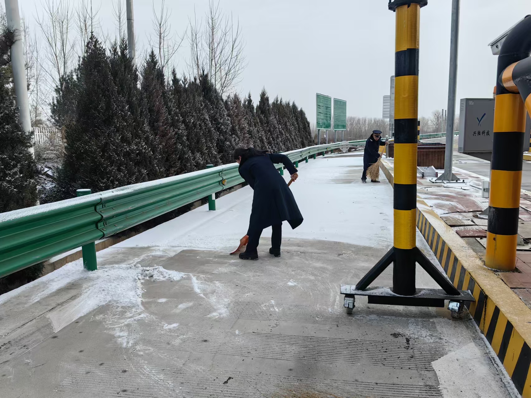降雪发生后,固安东收费站领导高度重视,立即组织站内职工开展除雪保畅工作。职工们迅速集结,携带除雪铲、扫帚、除雪车等工具,奔赴收费广场、收费车道等重点区域,对积雪进行清理。在站领导的指挥下,职工们分工明确、互相配合,有的使用除雪铲铲除厚重积雪,有的用扫帚清扫地面残余雪粒,还有的操作除雪车对大面积积雪进行清理。经过数小时的奋战,收费广场、收费车道、办公区域的积雪已清理完毕,道路恢复了畅通。