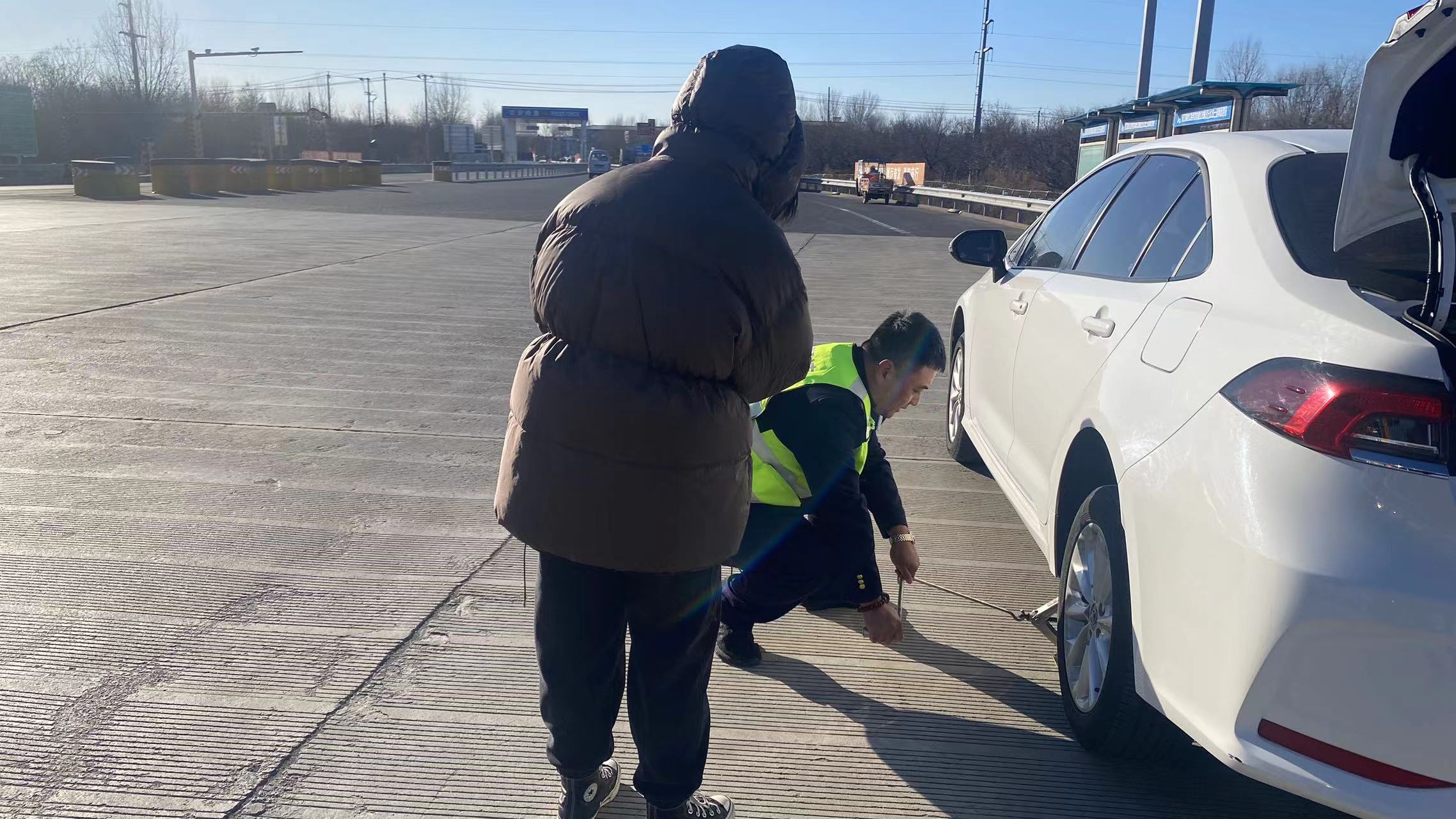 2月10日15时许,一辆白色轿车打着双闪缓缓驶入三河南收费站出口车道。该车女司机神色焦急,满脸为难地向收费员表示自己车胎亏气,收费人员能否帮忙更换轮胎。收费员迅速将情况报告班长。