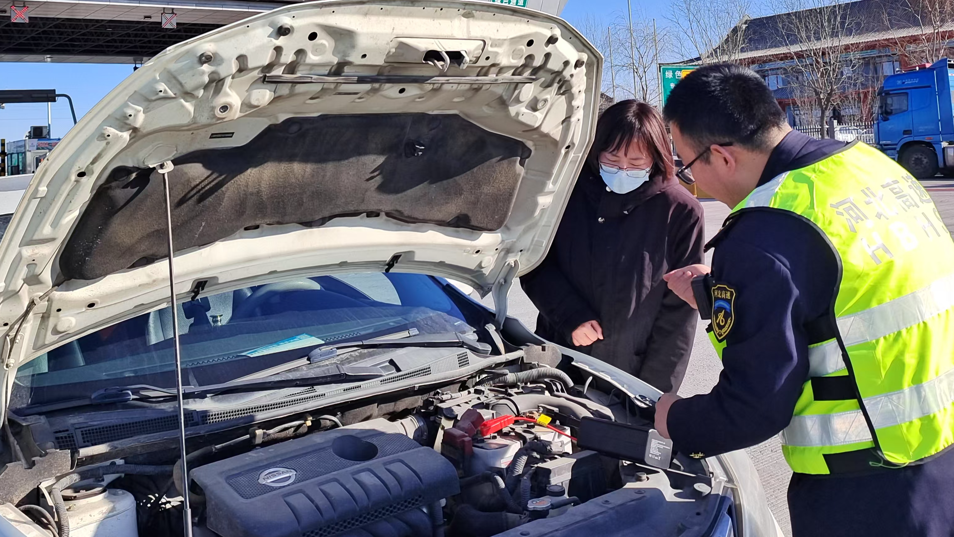廊坊分公司三河南收费站:车辆亏电困站口 搭线服务助司乘