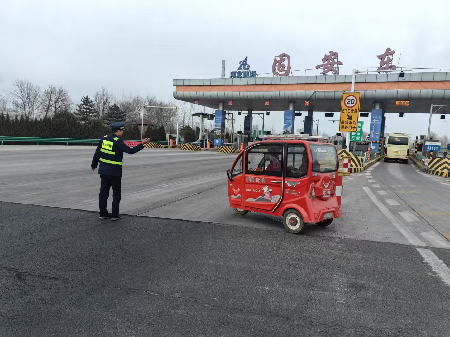 3月3日,在固安东收费站发生了一起电动车违规闯入高速公路的事件,收费站工作人员及时发现并成功拦截,有效避免了潜在的安全隐患。