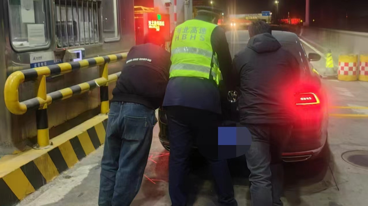 收费员发现状况,立即呼叫班长,班长迅速赶到现场。在尝试快速检修无果后,为避免拥堵加剧,决定先将车推出车道。他们站到车后,双手用力抵住车身,齐声喊着口号,脚步沉稳发力。小客车缓缓移动,最终被推到路边安全区域。