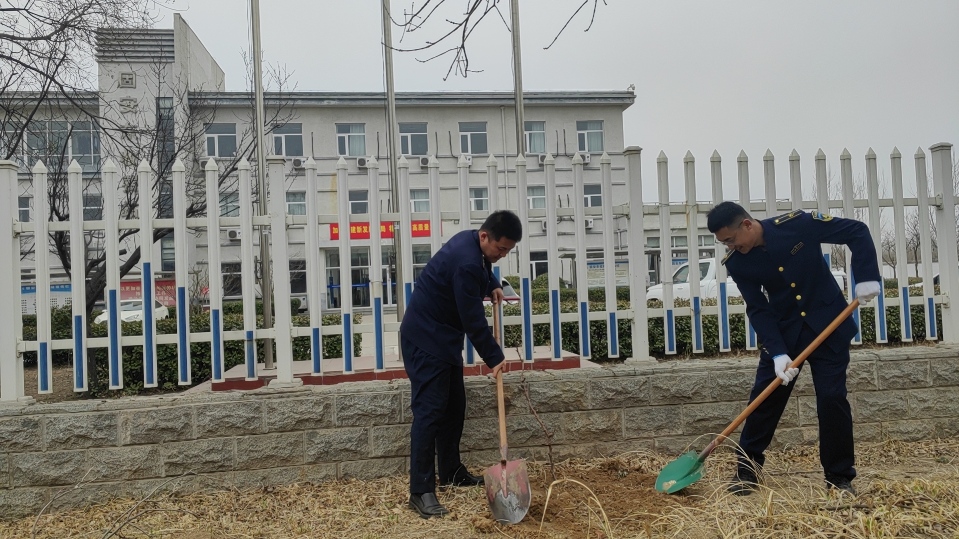 在活动现场,大家热情高涨,干劲十足,每一个人都全身心地投入到这项植树活动中。挖坑、栽苗、填土、浇水,每一个步骤都进行得井然有序,充满默契。经过一番辛勤劳动,一棵棵小树苗在春风中傲然挺立,为站区披上了一层绿色的新装。