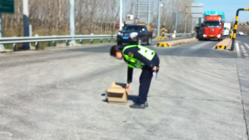 散落的纸箱不仅导致车辆无法正常通行,更严重的是,部分车辆为躲避纸箱,会突然改变行驶轨迹,与旁边车辆间距极小,稍有不慎就可能引发追尾、剐蹭等交通事故,存在严重安全隐患。正在附近巡查的班长快速跑上前,将散落的纸箱一一捡起,车道恢复正常通行。