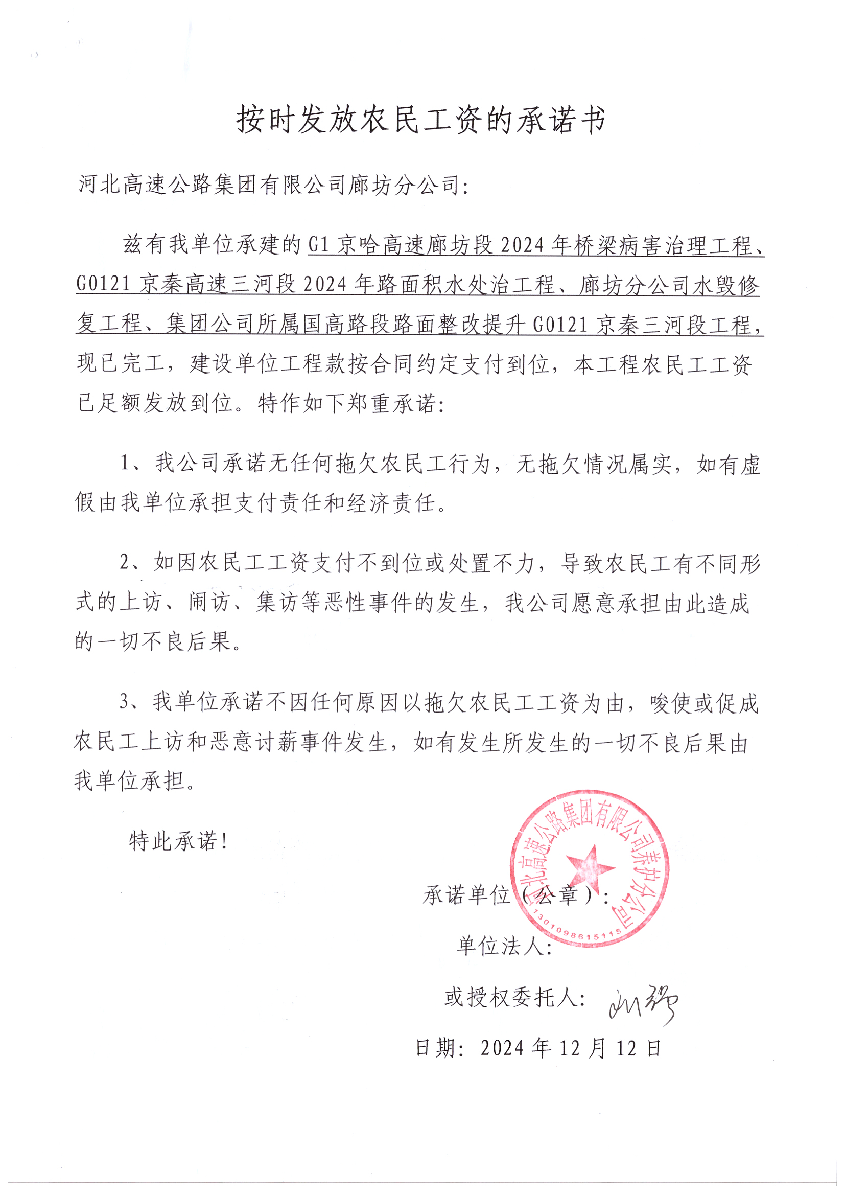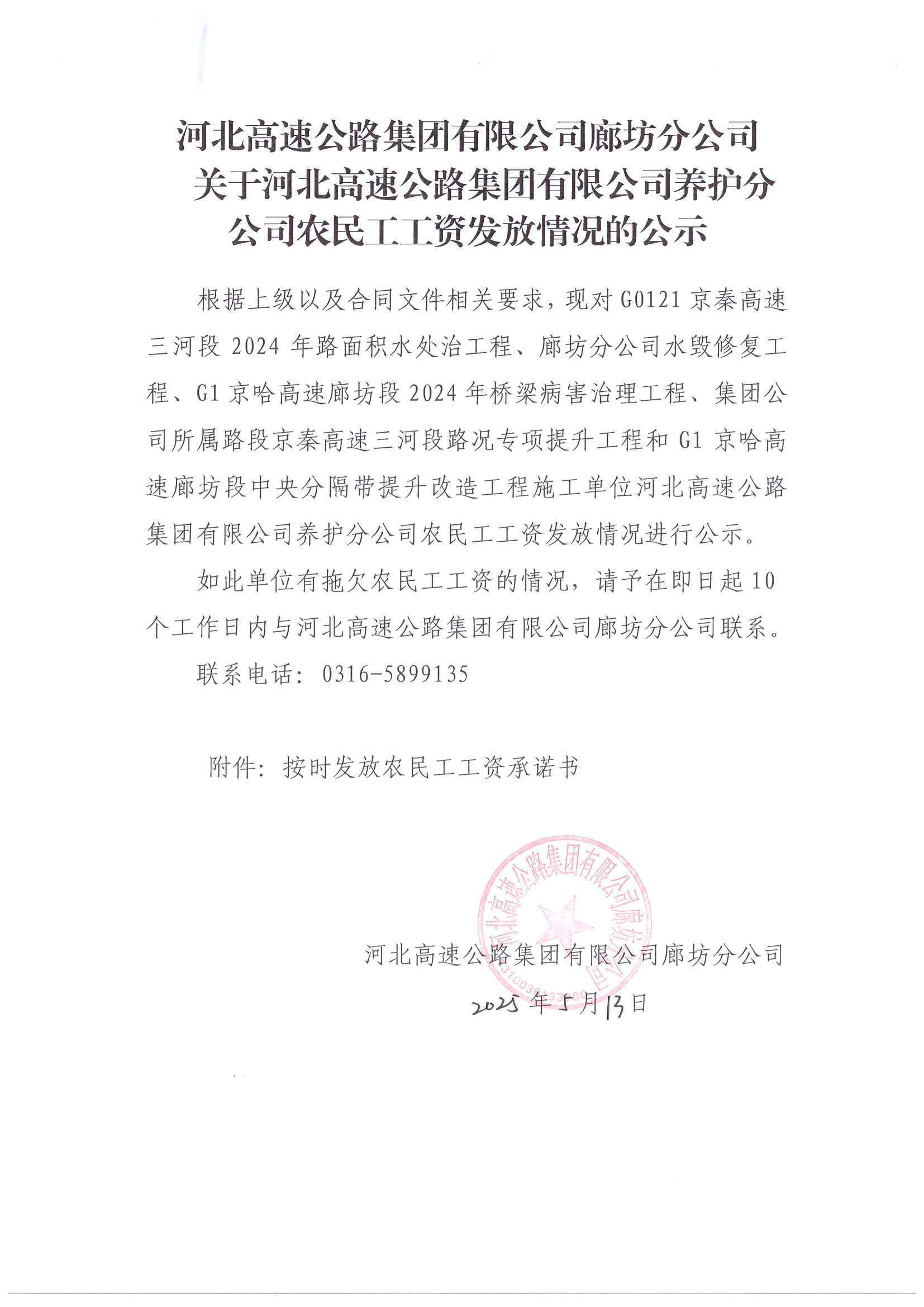 关于河北高速公路集团有限公司养护分公司农民工工资发放情况的公示