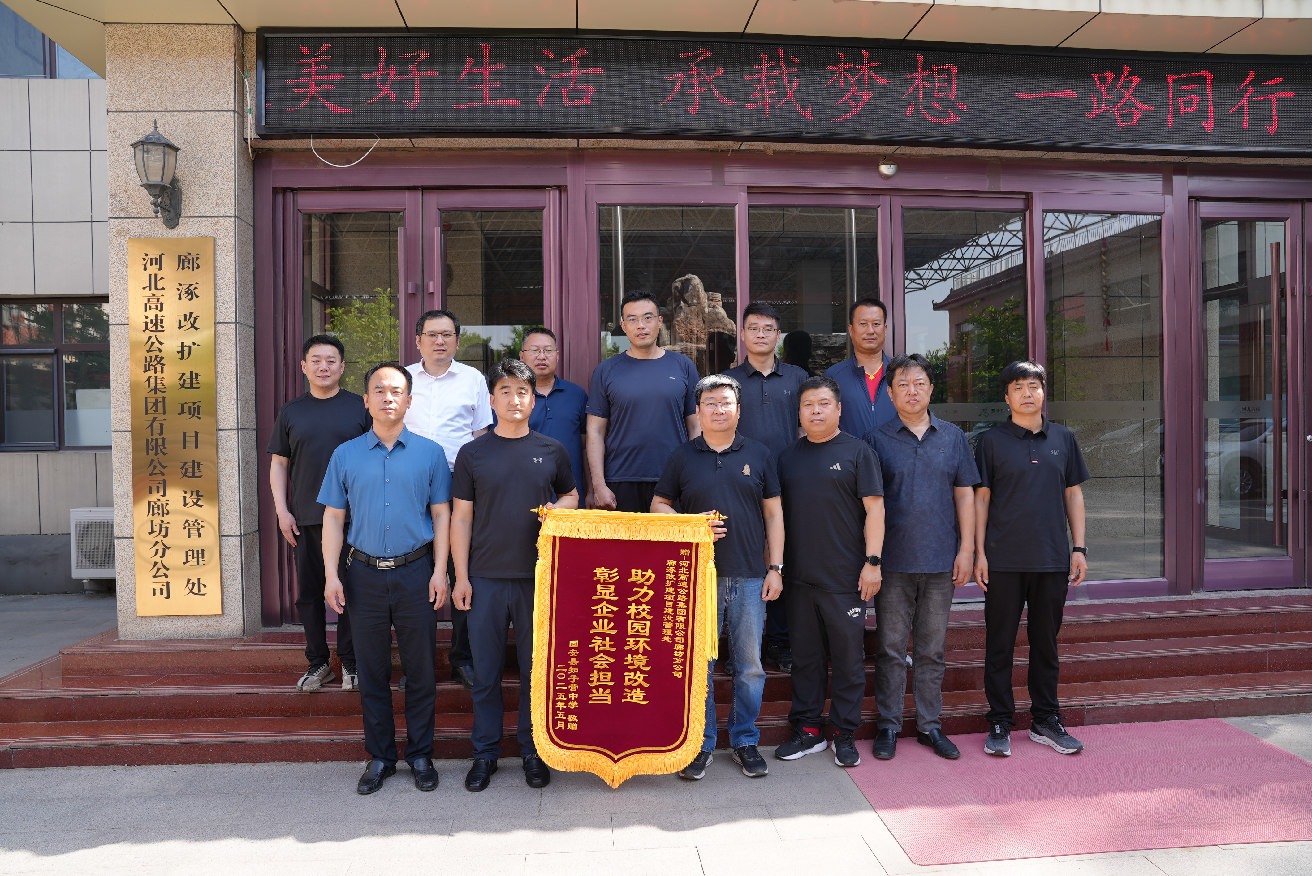 5月19日,廊涿高速改扩建项目建设管理处联合各参建单位携手廊坊市固安县知子营中学,开展“爱心助学 校企联合”共建活动,以实际行动践行国企央企社会责任,获赠“助力校园环境改造 彰显企业社会担当”荣誉锦旗,为深化校企合作、共筑教育振兴写下生动注脚。