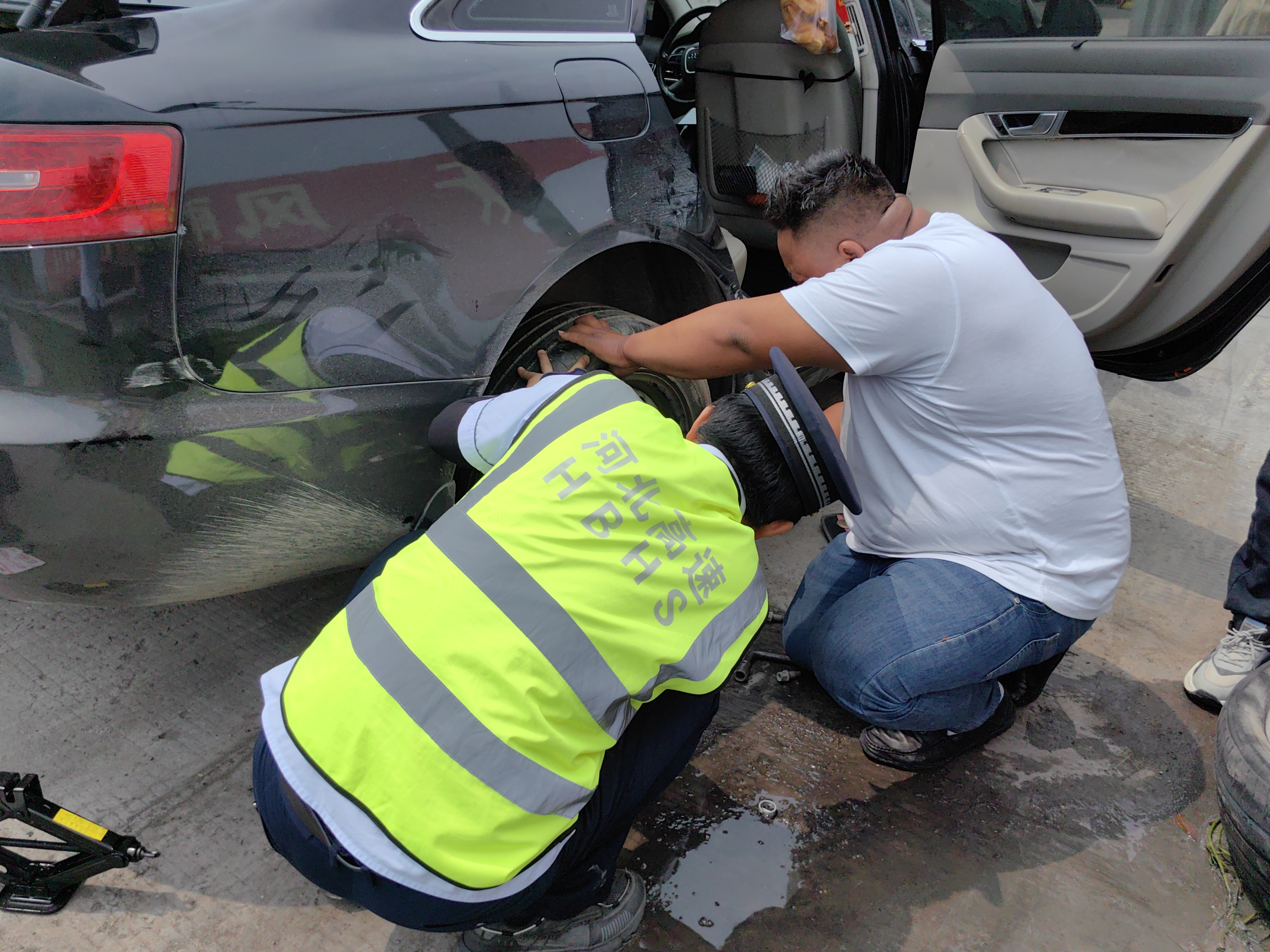经了解,车主因未携带更换轮胎所需工具,无法自行完成备胎更换。班长二话不说,立即返回站内取来专业千斤顶等维修工具,在现场协助车主更换轮胎。作业过程中,班长严格遵守安全操作规范,熟练完成破损轮胎拆卸和备胎安装紧固。