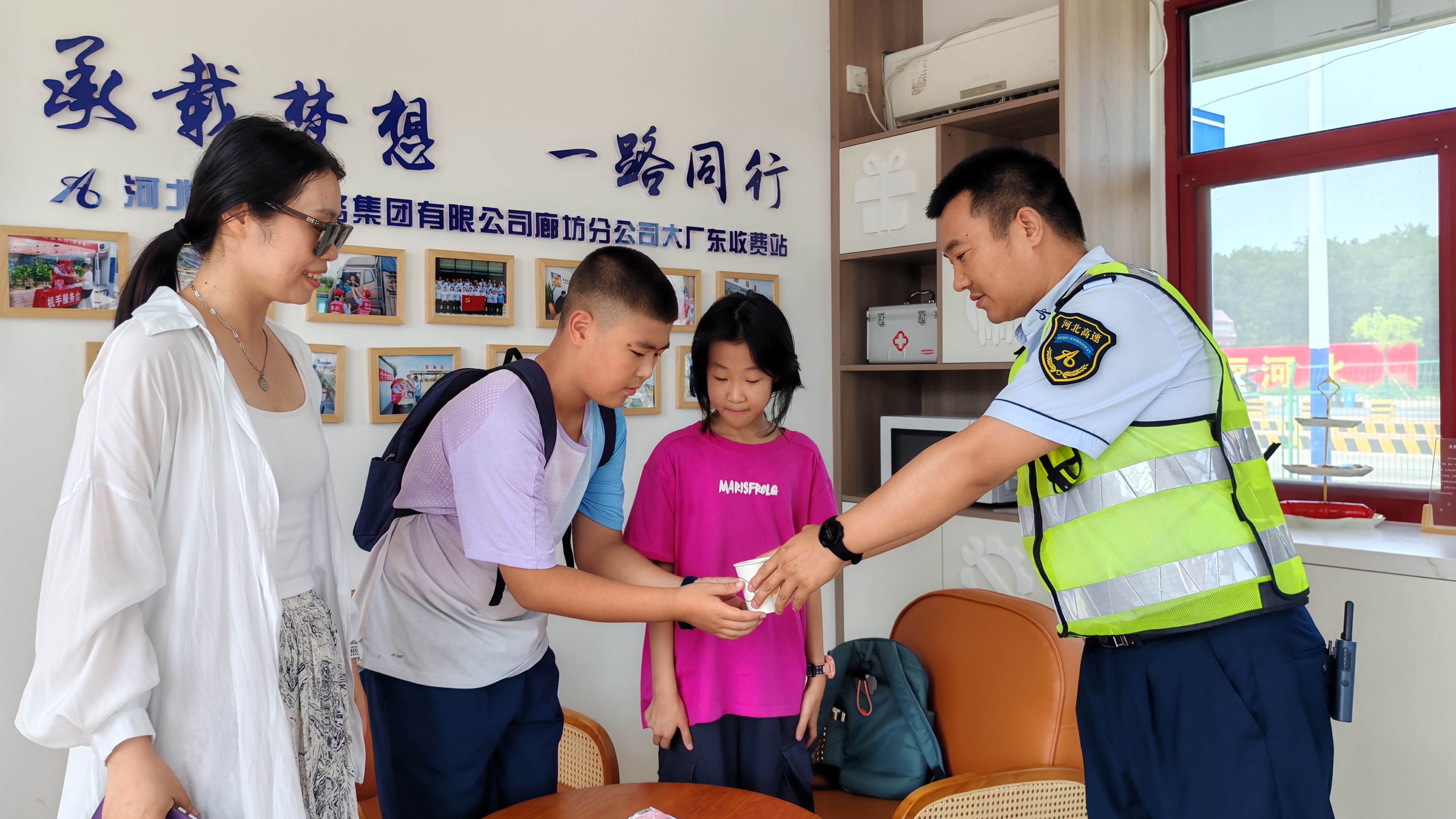 于是,班长赶紧带领母子三人到大厂东收费站的党群服务中心避暑休息。党群服务中心里清凉舒适,班长快速为他们提供了矿泉水补充水分,还为孩子们递上一些小零食缓解焦急情绪。看着孩子们渐渐恢复活力,母亲紧锁的眉头也舒展了不少。