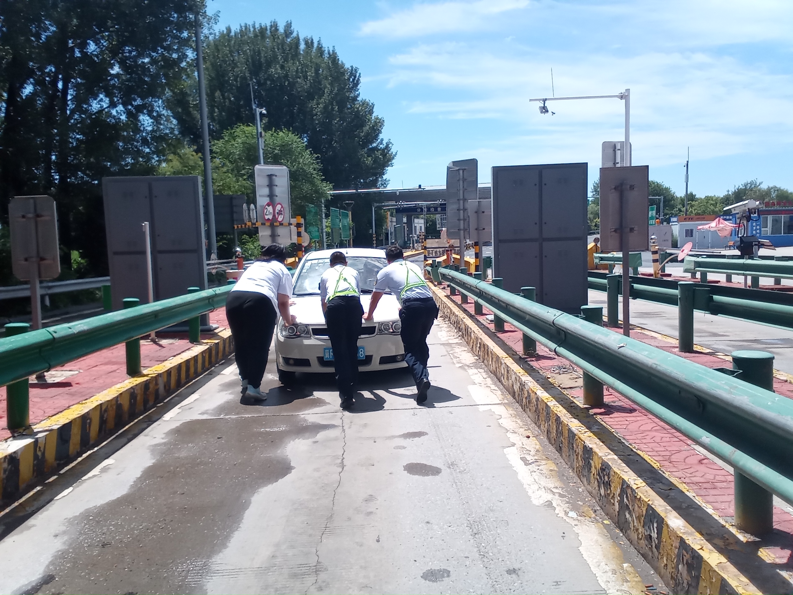 7月29日13时,,一辆白色轿车驶入固安南收费站入口车道后,突然熄火,多次尝试启动均未成功。司机焦急地在车内查看,一时间手足无措。正在岗亭内作业的发卡员听到动静后,立即报告收费班长。班长经询问得知车辆因电瓶故障无法启动,便安抚司机说道:“您别着急,我们来帮您想办法!”