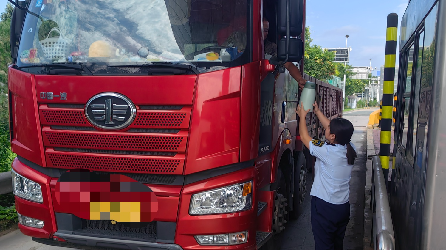 8月5日下午15时许,一辆货车缓缓驶入齐心庄收费站车道,刚停稳,司机便摇下车窗,手里举着一个保温杯询问收费员是否可以打一杯热水,收费员听到后,连忙接住保温壶给司机师傅接满热水后小心递上。司机大哥接过水杯,脸上露出朴实的笑容,连连向收费员道谢,随后满意地驾车驶离。
